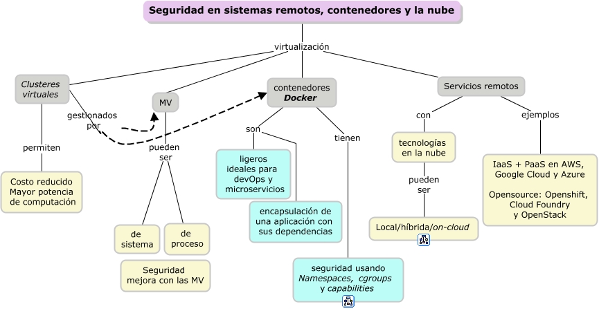 Este Cmap, tiene información relacionada con: ud6_mp_sist_locales_redes.cmap, MV pueden ser de sistema, Clusteres virtuales virtualización contenedores Dockers, MV pueden ser de proceso, ligeros ideales para devOps y microservicios son encapsulación de una aplicación con sus dependencias, contenedores Dockers tienen seguridad usando Namespaces, cgroups y capabilities, Servicios remotos con tecnologías en la nube, Clusteres virtuales virtualización Seguridad en sistemas locales (II), Clusteres virtuales virtualización Servicios remotos, contenedores Dockers son encapsulación de una aplicación con sus dependencias, Clusteres virtuales permiten Costo reducido Mayor potencia de computación, Clusteres virtuales virtualización MV, Servicios remotos ejemplos IaaS + PaaS en AWS, Google Cloud y Azure Opensource: Openshift, Cloud Foundry y OpenStack, tecnologías en la nube pueden ser Local/híbrida/on-cloud SaaS,PaaS,Iaas