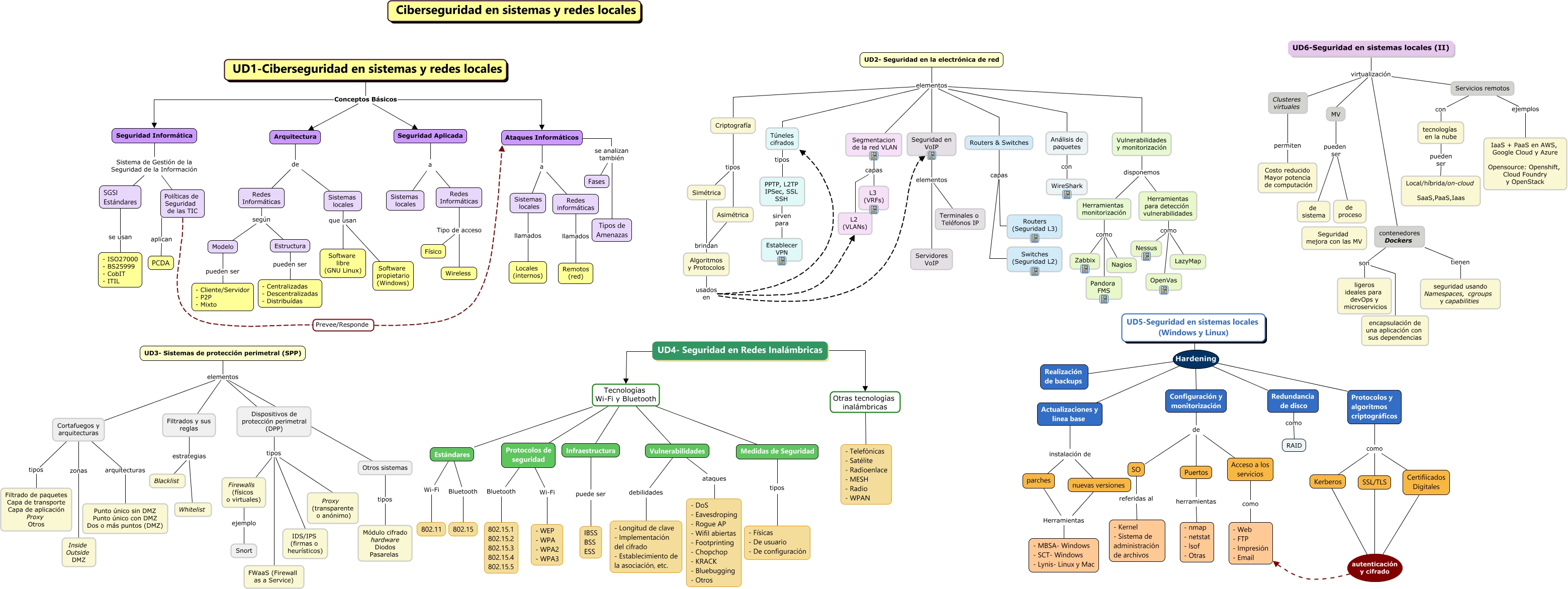 Este Cmap, tiene información relacionada con: MAPA COMPLETO CSLR, Algoritmos y Protocolos usados en Túneles cifrados, Seguridad en VoIP elementos Terminales o Teléfonos IP, UD4- Seguridad en Redes Inalámbricas Tecnologías Wi-Fi y Bluetooth Estándares, UD1-Ciberseguridad en sistemas y redes locales Conceptos Básicos Seguridad Informática, parches Herramientas - MBSA- Windows - SCT- Windows - Lynis- Linux y Mac, Actualizaciones y línea base instalación de nuevas versiones, UD5-Seguridad en sistemas locales (Windows y Linux) Hardening Configuración y monitorización, Dispositivos de protección perimetral (DPP) tipos FWaaS (Firewall as a Service), Modelo pueden ser - Cliente/Servidor - P2P - Mixto, Vulnerabilidades ataques - DoS - Eavesdroping - Rogue AP - WifiI abiertas - Footprinting - Chopchop - KRACK - Bluebugging - Otros, Configuración y monitorización de SO, Simétrica brindan Algoritmos y Protocolos, Ataques Informáticos a Sistemas locales, SGSI Estándares se usan - ISO27000 - BS25999 - CobIT - ITIL, UD5-Seguridad en sistemas locales (Windows y Linux) Hardening Realización de backups, Estructura pueden ser - Centralizadas - Descentralizadas - Distribuídas, Dispositivos de protección perimetral (DPP) tipos Firewalls (físicos o virtuales), UD4- Seguridad en Redes Inalámbricas Tecnologías Wi-Fi y Bluetooth Medidas de Seguridad, Criptografía elementos Vulnerabilidades y monitorización, Redes Informáticas según Modelo