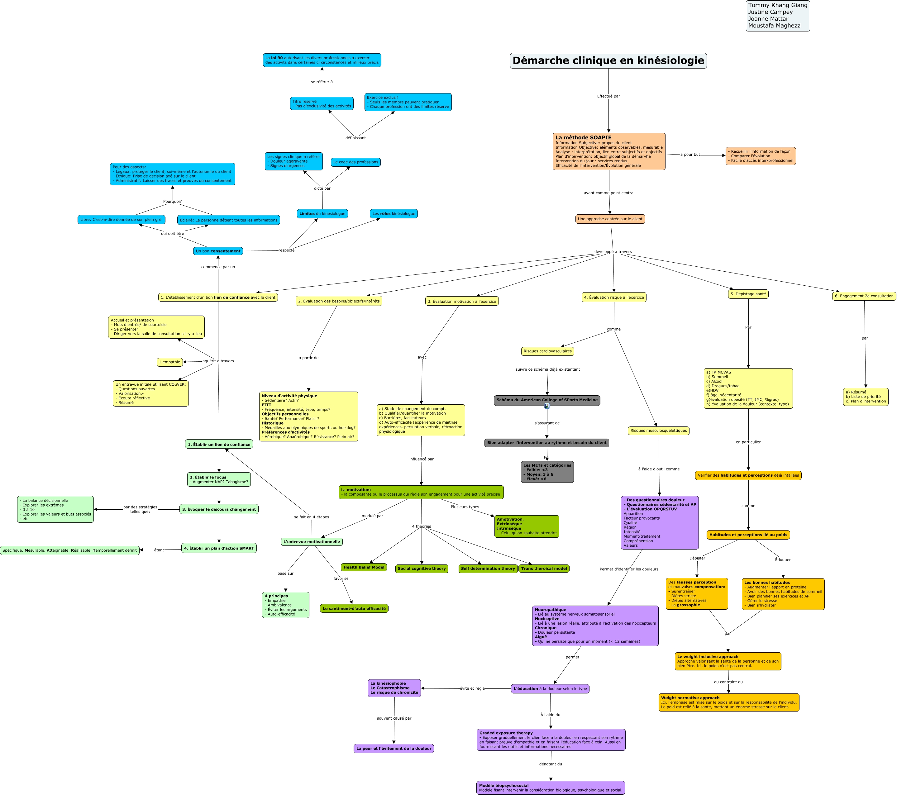 This Concept Map, created with IHMC CmapTools, has information related to: démarche_clinique_kin2040, 1. Établir un lien de confiance aquérit à travers Un entrevue initale utilisant COuVER: - Questions ouvertes - Valorisation,- - Écoute réflective - Résumé, Le code des professions définissant Titre réservé - Pas d'exclusivité des activités, La motivation: - la composante ou le processus qui règle son engagement pour une activité précise 4 théories Social cognitive theory, Titre réservé - Pas d'exclusivité des activités se référer à La loi 90 autorisant les divers professionnels à exercer des activits dans certaines circirconstances et milieux précis, Le weight inclusive approach Approche valorisant la santé de la personne et de son bien être. Ici, le poids n'est pas central. au contraire du Weight normative approach Ici, l'emphase est mise sur le poids et sur la responsabilité de l'individu. Le poid est relié à la santé, mettant un énorme stresse sur le client., 1. L'établissement d'un bon lien de confiance avec le client aquérit à travers L'empathie, La méthode SOAPIE Information Subjective: propos du client Information Objective: éléments observables, mesurable Analyse : interprétation, lien entre subjectifs et objectifs Plan d'intervention: objectif global de la démarvhe Intervention du jour : services rendus Efficacité de l'intervention/Évolution générale a pour but - Recueillir l'information de façon - Comparer l'évolution - Facile d'accès inter-professionnel, Une approche centrée sur le client développé à travers 6. Engagement 2e consultation, a) Stade de changement de compt. b) Qualifier/quantifier la motivation c) Barrières, facilitateurs d) Auto-efficacité (expérience de maitrise, expériences, persuation verbale, rétroaction physiologique influencé par La motivation: - la composante ou le processus qui règle son engagement pour une activité précise, Habitudes et perceptions lié au poids Éduquer Les bonnes habitudes - Augmenter l'apport en protéine - Avoir des bonnes habitudes de sommeil - Bien planifier ses exercices et AP - Gérer le stresse - Bien s'hydrater, a) FR MCVAS b) Sommeil c) Alcool d) Drogues/tabac e)HDV f) âge, sédentarité g)évaluation obésité (TT, IMC, %gras) h) évaluation de la douleur (contexte, type) en particulier Vérifier des habitudes et perceptions déjà intallées, 1. Établir un lien de confiance ???? 2. Établir le focus - Augmenter NAP? Tabagisme?, 1. L'établissement d'un bon lien de confiance avec le client commence par un Un bon consentement, Bien adapter l'intervention au rythme et besoin du client par Les METs et catégories - Faible: ɛ - Moyen: 3 à 6 - Élevé: ɲ, 3. Évoquer le discours changement ???? 4. Établir un plan d'action SMART, Une approche centrée sur le client développé à travers 2. Évaluation des besoins/objectifs/intérêts, 5. Dépistage santé Par a) FR MCVAS b) Sommeil c) Alcool d) Drogues/tabac e)HDV f) âge, sédentarité g)évaluation obésité (TT, IMC, %gras) h) évaluation de la douleur (contexte, type), La motivation: - la composante ou le processus qui règle son engagement pour une activité précise modulé par L'entrevue motivationnelle, Une approche centrée sur le client développé à travers 5. Dépistage santé, 6. Engagement 2e consultation par a) Résumé b) Liste de priorité c) Plan d'intervention
