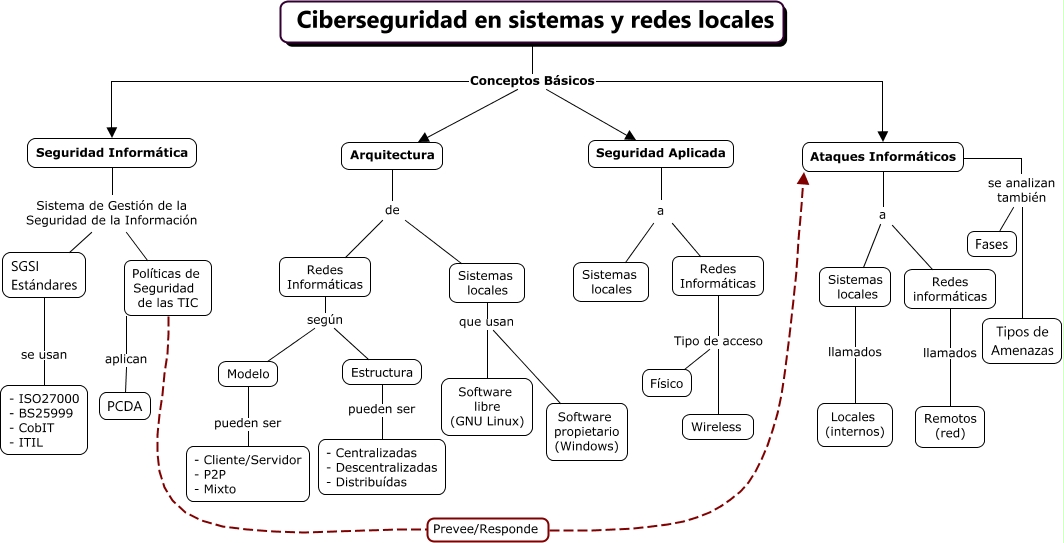 Este Cmap, tiene información relacionada con: UD1-IMPRIMIR.cmap, Ataques Informáticos se analizan también Fases, Ciberseguridad en sistemas y redes locales Conceptos Básicos Seguridad Informática, Modelo pueden ser - Cliente/Servidor - P2P - Mixto, Redes informáticas llamados Remotos (red), Seguridad Informática Sistema de Gestión de la Seguridad de la Información Políticas de Seguridad de las TIC, SGSI Estándares se usan - ISO27000 - BS25999 - CobIT - ITIL, Estructura pueden ser - Centralizadas - Descentralizadas - Distribuídas, Ataques Informáticos a Redes informáticas, Seguridad Aplicada a Sistemas locales, Seguridad Informática Sistema de Gestión de la Seguridad de la Información SGSI Estándares, Ataques Informáticos a Sistemas locales, Seguridad Aplicada a Redes Informáticas, Sistemas locales que usan Software libre (GNU Linux), Sistemas locales que usan Software propietario (Windows), Arquitectura de Redes Informáticas, Ciberseguridad en sistemas y redes locales Conceptos Básicos Ataques Informáticos, Ciberseguridad en sistemas y redes locales Conceptos Básicos Arquitectura, Redes Informáticas Tipo de acceso Wireless, Sistemas locales llamados Locales (internos), Redes Informáticas Tipo de acceso Físico