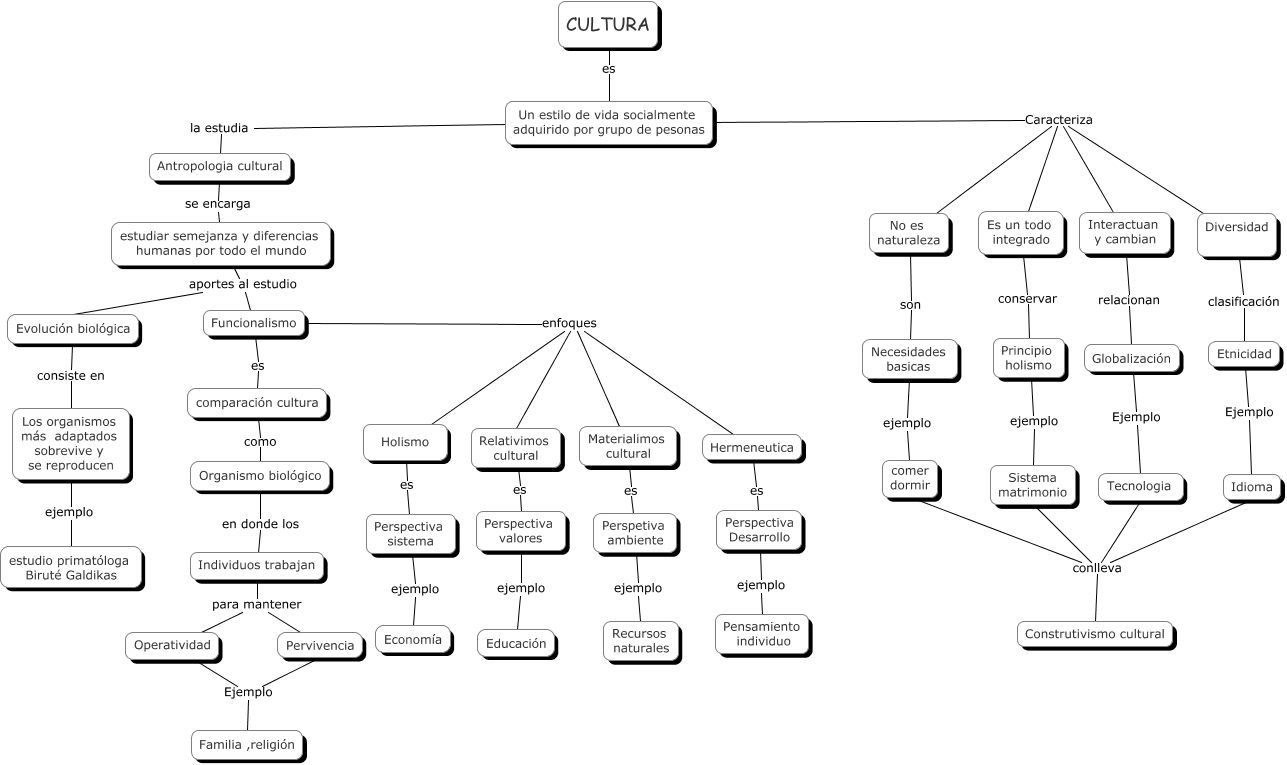 Este Cmap, tiene información relacionada con: cultura, Interactuan y cambian relacionan Globalización, Materialimos cultural es Perspetiva ambiente, Operatividad Ejemplo Familia ,religión, comparación cultura como Organismo biológico, estudiar semejanza y diferencias humanas por todo el mundo aportes al estudio Evolución biológica, Perspectiva sistema ejemplo Economía, Funcionalismo enfoques Materialimos cultural, Perspectiva valores ejemplo Educación, Relativimos cultural es Perspectiva valores, Un estilo de vida socialmente adquirido por grupo de pesonas Caracteriza Diversidad, Globalización Ejemplo Tecnologia, Funcionalismo es comparación cultura, comer dormir conlleva Tecnologia, Perspetiva ambiente ejemplo Recursos naturales, estudiar semejanza y diferencias humanas por todo el mundo aportes al estudio Funcionalismo, Un estilo de vida socialmente adquirido por grupo de pesonas Caracteriza No es naturaleza, Un estilo de vida socialmente adquirido por grupo de pesonas la estudia Antropologia cultural, Individuos trabajan para mantener Pervivencia, Organismo biológico en donde los Individuos trabajan, Un estilo de vida socialmente adquirido por grupo de pesonas Caracteriza Interactuan y cambian