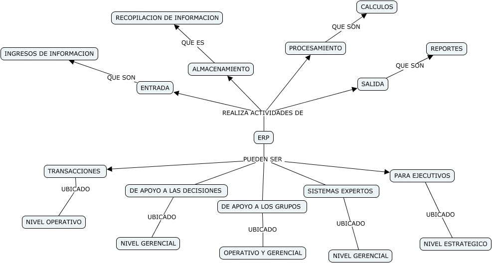 Este Cmap, tiene información relacionada con: ERP MAPA, ERP REALIZA ACTIVIDADES DE ALMACENAMIENTO, ERP PUEDEN SER PARA EJECUTIVOS, PARA EJECUTIVOS UBICADO NIVEL ESTRATEGICO, ERP PUEDEN SER SISTEMAS EXPERTOS, TRANSACCIONES UBICADO NIVEL OPERATIVO, DE APOYO A LAS DECISIONES UBICADO NIVEL GERENCIAL, ERP PUEDEN SER DE APOYO A LOS GRUPOS, SISTEMAS EXPERTOS UBICADO NIVEL GERENCIAL, SALIDA QUE SON REPORTES, DE APOYO A LOS GRUPOS UBICADO OPERATIVO Y GERENCIAL, ERP REALIZA ACTIVIDADES DE ENTRADA, ERP PUEDEN SER DE APOYO A LAS DECISIONES, ALMACENAMIENTO QUE ES RECOPILACION DE INFORMACION, ENTRADA QUE SON INGRESOS DE INFORMACION, PROCESAMIENTO QUE SON CALCULOS, ERP REALIZA ACTIVIDADES DE SALIDA, ERP PUEDEN SER TRANSACCIONES, ERP REALIZA ACTIVIDADES DE PROCESAMIENTO