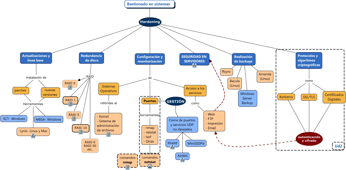 Este Cmap, tiene información relacionada con: ud5_ciberseguridad_sistemas_locales_redesnew.cmap, Sistemas Operativos referidas al - Kernel - Sistema de administración de archivos, Certifiicados Digitales autenticación y cifrado - Web - FTP - Impresión - Email, Redundancia de disco RAID RAID 5, Configuración y monitorización de Puertos, Bastionado en sistemas Hardening Realización de backups, Protocolos y algoritmos criptográficos como Kerberos, Actualizaciones y línea base instalación de nuevas versiones, - nmap - netstat - lsof - Otras comandos netstat, Kerberos autenticación y cifrado - Web - FTP - Impresión - Email, Puertos herramientas - nmap - netstat - lsof - Otras, Bastionado en sistemas Hardening Redundancia de disco, Redundancia de disco RAID RAID 6 RAID 50 etc., Bastionado en sistemas Hardening Configuración y monitorización, Realización de backups Amanda, nuevas versiones Herramientas - MBSA- Windows - SCT- Windows - Lynis- Linux y Mac, Realización de backups Rsync, Redundancia de disco RAID RAID 0, Configuración y monitorización de Sistemas Operativos, Bastionado en sistemas Hardening Protocolos y algoritmos criptográficos, Protocolos y algoritmos criptográficos como SSL/TLS