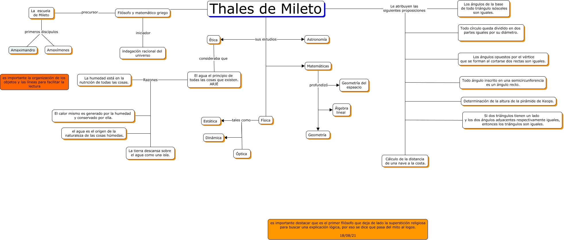 This Concept Map, created with IHMC CmapTools, has information related to: Thales de Mileto, Thales de Mileto Le atribuyen las siguientes proposiciones Cálculo de la distancia de una nave a la costa., Thales de Mileto Le atribuyen las siguientes proposiciones Los ángulos de la base de todo triángulo isósceles son iguales., El agua el principio de todas las cosas que existen. ARJË Razones El calor mismo es generado por la humedad y conservado por ella., El agua el principio de todas las cosas que existen. ARJË Razones La humedad está en la nutrición de todas las cosas., Física tales como Óptica, Thales de Mileto Le atribuyen las siguientes proposiciones Determinación de la altura de la pirámide de Keops., Thales de Mileto Le atribuyen las siguientes proposiciones Todo círculo queda dividido en dos partes iguales por su diámetro., Filósofo y matemático griego precursor La escuela de Mileto, Matemáticas profundizó Geometría del espaacio, Thales de Mileto sus estudios Astronomía, Física sus estudios Astronomía, El agua el principio de todas las cosas que existen. ARJË Razones La tierra descansa sobre el agua como una isla., Thales de Mileto Le atribuyen las siguientes proposiciones Si dos triángulos tienen un lado y los dos ángulos adyacentes respectivamente iguales, entonces los triángulos son iguales., Thales de Mileto sus estudios Matemáticas, Filósofo y matemático griego iniciador indagación racional del universo, La escuela de Mileto primeros discipulos Amaximandro, El agua el principio de todas las cosas que existen. ARJË Razones el agua es el origen de la naturaleza de las cosas húmedas., Física sus estudios Matemáticas, Matemáticas profundizó Álgebra lineal, Thales de Mileto sus estudios Ética