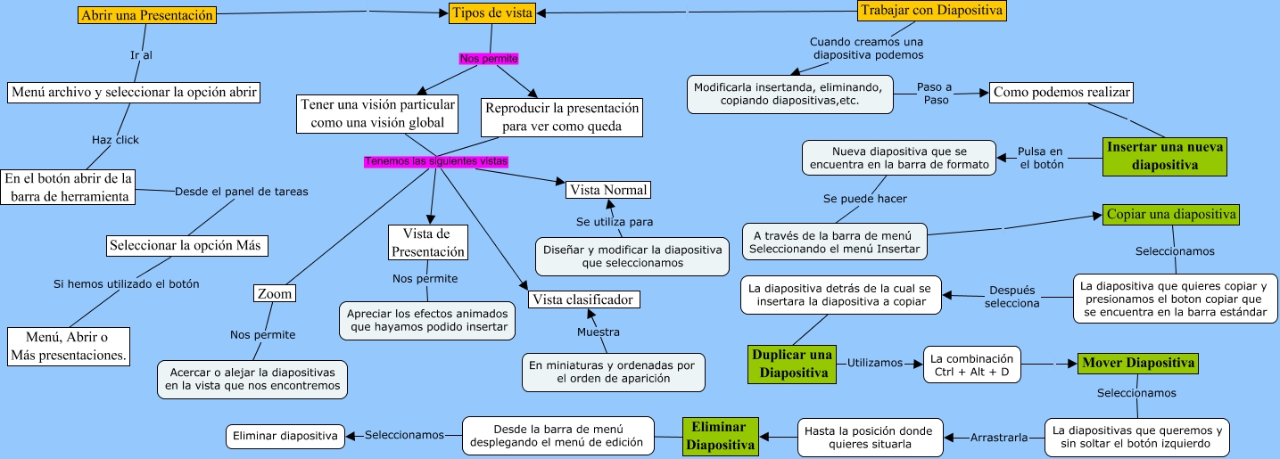 Este Cmap, tiene información relacionada con: mapas de computacion, Duplicar una Diapositiva Utilizamos La combinación Ctrl + Alt + D, Seleccionar la opción Más Si hemos utilizado el botón Menú, Abrir o Más presentaciones., En el botón abrir de la barra de herramienta Desde el panel de tareas Seleccionar la opción Más, Diseñar y modificar la diapositiva que seleccionamos Se utiliza para Vista Normal, Desde la barra de menú desplegando el menú de edición Seleccionamos Eliminar diapositiva, Abrir una Presentación Ir al Menú archivo y seleccionar la opción abrir, Trabajar con Diapositiva Cuando creamos una diapositiva podemos Modificarla insertanda, eliminando, copiando diapositivas,etc., En miniaturas y ordenadas por el orden de aparición Muestra Vista clasificador, Mover Diapositiva Seleccionamos La diapositivas que queremos y sin soltar el botón izquierdo, Como podemos realizar Insertar una nueva diapositiva, Copiar una diapositiva Seleccionamos La diapositiva que quieres copiar y presionamos el boton copiar que se encuentra en la barra estándar, Zoom Tenemos las siguientes vistas Vista de Presentación, Menú archivo y seleccionar la opción abrir Haz click En el botón abrir de la barra de herramienta, Zoom Nos permite Acercar o alejar la diapositivas en la vista que nos encontremos, Modificarla insertanda, eliminando, copiando diapositivas,etc. Paso a Paso Como podemos realizar, Eliminar Diapositiva Desde la barra de menú desplegando el menú de edición, Reproducir la presentación para ver como queda Tenemos las siguientes vistas Vista de Presentación, Trabajar con Diapositiva Tipos de vista, Zoom Tenemos las siguientes vistas Vista clasificador, Abrir una Presentación Tipos de vista