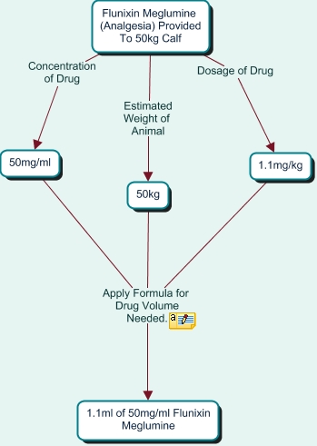 This Concept Map, created with IHMC CmapTools, has information related to: Flunixine Meglumine Calculations, 50mg/ml Apply Formula for Drug Volume Needed. 1.1ml of 50mg/ml Flunixin Meglumine, Flunixin Meglumine (Analgesia) Provided To 50kg Calf Estimated Weight of Animal 50kg, Flunixin Meglumine (Analgesia) Provided To 50kg Calf Dosage of Drug 1.1mg/kg, 1.1mg/kg Apply Formula for Drug Volume Needed. 1.1ml of 50mg/ml Flunixin Meglumine, Flunixin Meglumine (Analgesia) Provided To 50kg Calf Concentration of Drug 50mg/ml, 50kg Apply Formula for Drug Volume Needed. 1.1ml of 50mg/ml Flunixin Meglumine