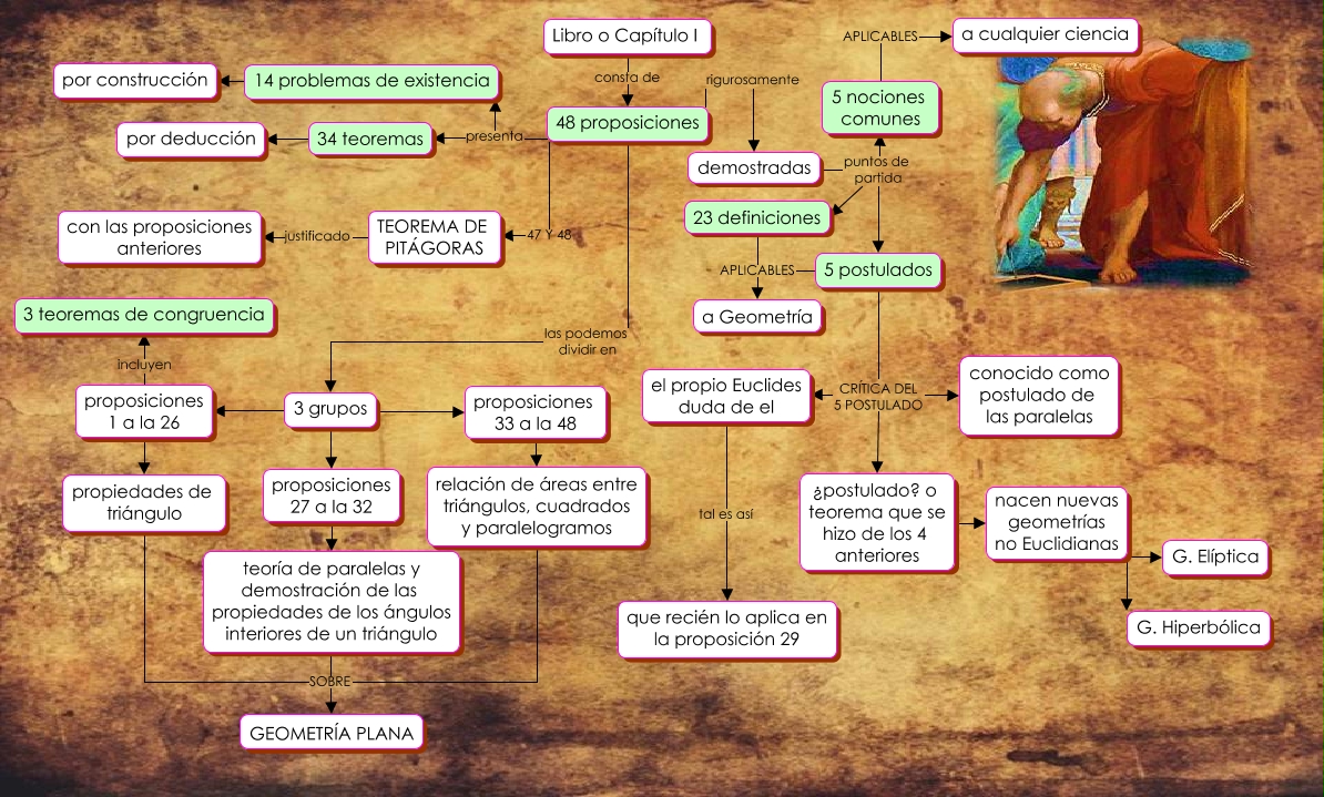 Este Cmap, tiene información relacionada con: libro 1, 5 postulados CRÍTICA DEL 5 POSTULADO el propio Euclides duda de el, Libro o Capítulo I consta de 48 proposiciones, 23 definiciones APLICABLES a Geometría, proposiciones 27 a la 32 teoría de paralelas y demostración de las propiedades de los ángulos interiores de un triángulo, relación de áreas entre triángulos, cuadrados y paralelogramos SOBRE GEOMETRÍA PLANA, TEOREMA DE PITÁGORAS justificado con las proposiciones anteriores, 3 grupos proposiciones 33 a la 48, 14 problemas de existencia por construcción, demostradas puntos de partida 23 definiciones, 5 postulados APLICABLES a Geometría, demostradas puntos de partida 5 postulados, demostradas puntos de partida 5 nociones comunes, 48 proposiciones 47 Y 48 TEOREMA DE PITÁGORAS, 5 postulados CRÍTICA DEL 5 POSTULADO ¿postulado? o teorema que se hizo de los 4 anteriores, 48 proposiciones presenta 14 problemas de existencia, proposiciones 33 a la 48 relación de áreas entre triángulos, cuadrados y paralelogramos, el propio Euclides duda de el tal es así que recién lo aplica en la proposición 29, propiedades de triángulo SOBRE GEOMETRÍA PLANA, 34 teoremas por deducción, 5 nociones comunes APLICABLES a cualquier ciencia