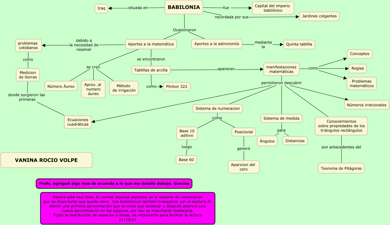 Este Cmap, tiene información relacionada con: BABILONIA, Aportes a la matemática se creó Método de irrigación, Conociemientos sobre propiedades de los triángulos rectángulos son antecedentes del Teorema de Pitágoras, BABILONIA fue Capital del imperio babilónico, BABILONIA Ocasionaron Aportes a la astronomía, manifestaciones matemáticas permitieron descubrir Conociemientos sobre propiedades de los triángulos rectángulos, Sistema de numeracion como Posicional, Aportes a la astronomía mediante la Quinta tablilla, manifestaciones matemáticas permitieron descubrir Ecuaciones cuadráticas, Tablillas de arcilla como Plinton 322, Sistema de numeracion como Base 10 aditivo, manifestaciones matemáticas permitieron descubrir Números irracionales, manifestaciones matemáticas permitieron descubrir Sistema de medida, manifestaciones matemáticas como Reglas, manifestaciones matemáticas como Conceptos, problemas cotidianos como Medicion de tierras, Aportes a la matemática debido a la necesidad de resolver problemas cotidianos, Posicional generó Aparicion del cero, manifestaciones matemáticas permitieron descubrir Sistema de numeracion, Aportes a la matemática se encontraron Tablillas de arcilla, Tablillas de arcilla aparecen manifestaciones matemáticas