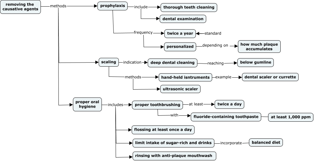 This Concept Map, created with IHMC CmapTools, has information related to: pls ignore sksk SHEILA CZAR extension, fluoride-containing toothpaste ???? at least 1,000 ppm, scaling indication deep dental cleaning, proper oral hygiene includes rinsing with anti-plaque mouthwash, deep dental cleaning reaching below gumline, scaling methods hand-held isntruments, prophylaxis include dental examination, proper toothbrushing with fluoride-containing toothpaste, removing the causative agents methods scaling, scaling methods ultrasonic scaler, prophylaxis frequency twice a year, removing the causative agents methods proper oral hygiene, proper toothbrushing at least twice a day, removing the causative agents methods prophylaxis, personalized depending on how much plaque accumulates, prophylaxis include thorough teeth cleaning, hand-held isntruments example dental scaler or currette, proper oral hygiene includes proper toothbrushing, prophylaxis frequency personalized, proper oral hygiene includes limit intake of sugar-rich and drinks, proper oral hygiene includes flossing at least once a day