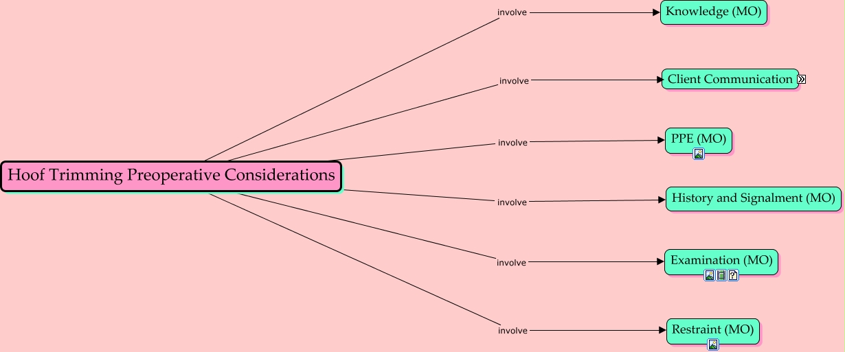This Concept Map, created with IHMC CmapTools, has information related to: Hoof Trimming Preoperative Considerations, Hoof Trimming Preoperative Considerations involve Restraint (MO), Hoof Trimming Preoperative Considerations involve History and Signalment (MO), Hoof Trimming Preoperative Considerations involve Examination (MO), Client Communication involves Cost (MO), Hoof Trimming Preoperative Considerations involve Client Communication, Hoof Trimming Preoperative Considerations involve PPE (MO), Client Communication involves Withdrawal Times (MO), Client Communication involves Benefits (MO), Hoof Trimming Preoperative Considerations involve Knowledge (MO), Client Communication involves Risks (MO)