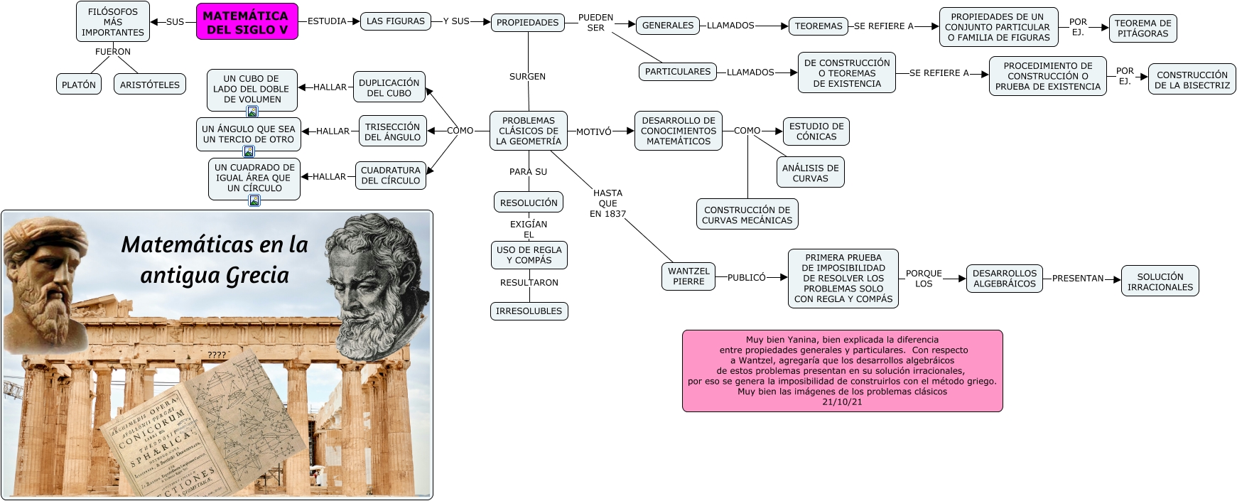 Este Cmap, tiene información relacionada con: 5. MATEMÁTICA DEL SIGLO V, PROPIEDADES DE UN CONJUNTO PARTICULAR O FAMILIA DE FIGURAS POR EJ. TEOREMA DE PITÁGORAS, PROCEDIMIENTO DE CONSTRUCCIÓN O PRUEBA DE EXISTENCIA POR EJ. CONSTRUCCIÓN DE LA BISECTRIZ, PARTICULARES LLAMADOS DE CONSTRUCCIÓN O TEOREMAS DE EXISTENCIA, PROBLEMAS CLÁSICOS DE LA GEOMETRÍA MOTIVÓ DESARROLLO DE CONOCIMIENTOS MATEMÁTICOS, TEOREMAS SE REFIERE A PROPIEDADES DE UN CONJUNTO PARTICULAR O FAMILIA DE FIGURAS, GENERALES LLAMADOS TEOREMAS, PROBLEMAS CLÁSICOS DE LA GEOMETRÍA COMO DUPLICACIÓN DEL CUBO, WANTZEL PIERRE PUBLICÓ PRIMERA PRUEBA DE IMPOSIBILIDAD DE RESOLVER LOS PROBLEMAS SOLO CON REGLA Y COMPÁS, DESARROLLO DE CONOCIMIENTOS MATEMÁTICOS COMO ANÁLISIS DE CURVAS, PROPIEDADES SURGEN PROBLEMAS CLÁSICOS DE LA GEOMETRÍA, PROBLEMAS CLÁSICOS DE LA GEOMETRÍA COMO TRISECCIÓN DEL ÁNGULO, MATEMÁTICA DEL SIGLO V ESTUDIA LAS FIGURAS, CUADRATURA DEL CÍRCULO HALLAR UN CUADRADO DE IGUAL ÁREA QUE UN CÍRCULO, RESOLUCIÓN EXIGÍAN EL USO DE REGLA Y COMPÁS, PROBLEMAS CLÁSICOS DE LA GEOMETRÍA PARA SU RESOLUCIÓN, PRIMERA PRUEBA DE IMPOSIBILIDAD DE RESOLVER LOS PROBLEMAS SOLO CON REGLA Y COMPÁS PORQUE LOS DESARROLLOS ALGEBRÁICOS, LAS FIGURAS Y SUS PROPIEDADES, DE CONSTRUCCIÓN O TEOREMAS DE EXISTENCIA SE REFIERE A PROCEDIMIENTO DE CONSTRUCCIÓN O PRUEBA DE EXISTENCIA, FILÓSOFOS MÁS IMPORTANTES FUERON PLATÓN, DESARROLLO DE CONOCIMIENTOS MATEMÁTICOS COMO ESTUDIO DE CÓNICAS