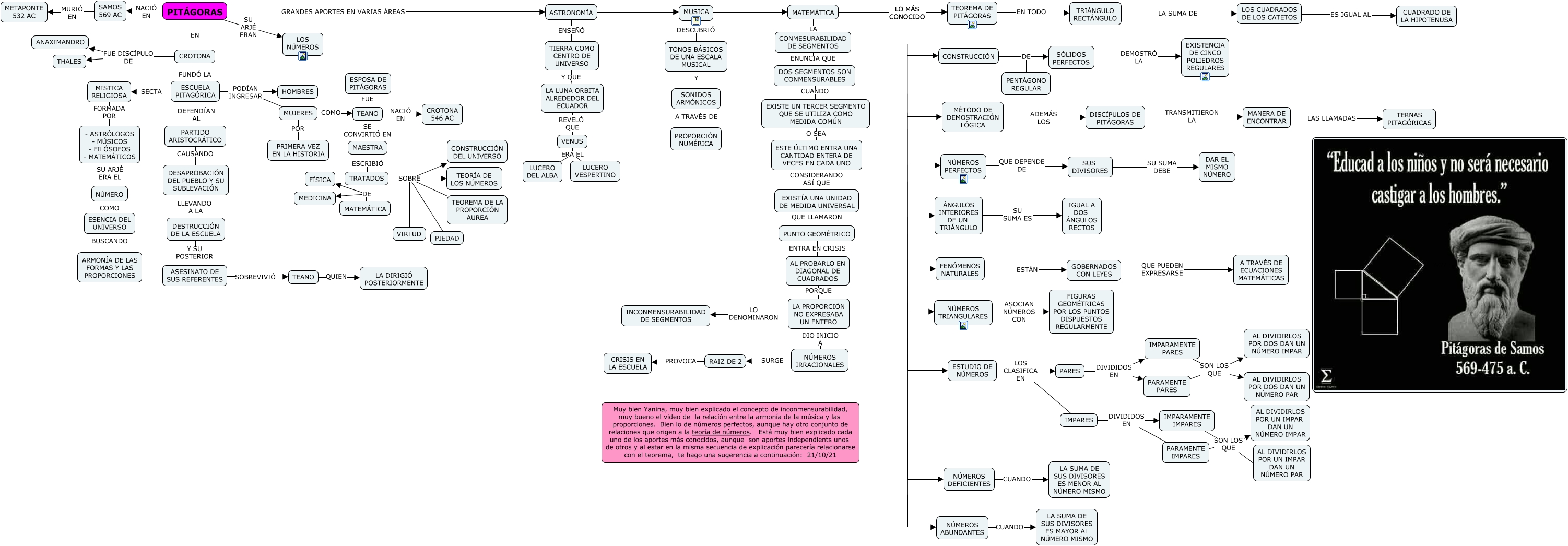 Este Cmap, tiene información relacionada con: 4. PITAGORAS, IMPARES DIVIDIDOS EN PARAMENTE IMPARES, TRATADOS DE MATEMÁTICA, ESCUELA PITAGÓRICA PODÍAN INGRESAR MUJERES, PUNTO GEOMÉTRICO ENTRA EN CRISIS AL PROBARLO EN DIAGONAL DE CUADRADOS, TRATADOS SOBRE PIEDAD, PARTIDO ARISTOCRÁTICO CAUSANDO DESAPROBACIÓN DEL PUEBLO Y SU SUBLEVACIÓN, PITÁGORAS EN CROTONA, CROTONA FUE DISCÍPULO DE THALES, IMPARAMENTE PARES SON LOS QUE AL DIVIDIRLOS POR DOS DAN UN NÚMERO PAR, LA PROPORCIÓN NO EXPRESABA UN ENTERO LO DENOMINARON INCONMENSURABILIDAD DE SEGMENTOS, AL PROBARLO EN DIAGONAL DE CUADRADOS PORQUE LA PROPORCIÓN NO EXPRESABA UN ENTERO, MUSICA DESCUBRIÓ TONOS BÁSICOS DE UNA ESCALA MUSICAL, NÚMEROS TRIANGULARES ASOCIAN NÚMEROS CON FIGURAS GEOMÉTRICAS POR LOS PUNTOS DISPUESTOS REGULARMENTE, ASESINATO DE SUS REFERENTES SOBREVIVIÓ TEANO, CONSTRUCCIÓN DE PENTÁGONO REGULAR, TRATADOS SOBRE VIRTUD, MISTICA RELIGIOSA FORMADA POR - ASTRÓLOGOS - MÚSICOS - FILÓSOFOS - MATEMÁTICOS, CROTONA FUE DISCÍPULO DE ANAXIMANDRO, TEANO QUIEN LA DIRIGIÓ POSTERIORMENTE, MATEMÁTICA LO MÁS CONOCIDO CONSTRUCCIÓN