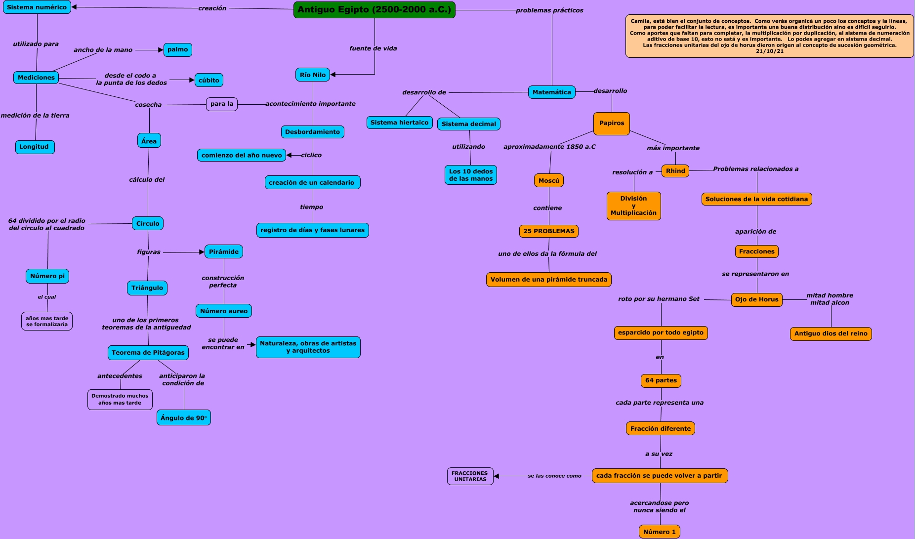 This Concept Map, created with IHMC CmapTools, has information related to: Sanchez Camila. Mapa Egipto, 25 PROBLEMAS uno de ellos da la fórmula del Volumen de una pirámide truncada, Mediciones desde el codo a la punta de los dedos cúbito, Antiguo Egipto (2500-2000 a.C.) problemas prácticos Matemática, esparcido por todo egipto en 64 partes, Círculo 64 dividido por el radio del circulo al cuadrado Número pi, 64 partes cada parte representa una Fracción diferente, Rhind Problemas relacionados a Soluciones de la vida cotidiana, cada fracción se puede volver a partir acercandose pero nunca siendo el Número 1, Mediciones cosecha Área, Número pi el cual años mas tarde se formalizaria, Teorema de Pitágoras antecedentes Demostrado muchos años mas tarde, Soluciones de la vida cotidiana aparición de Fracciones, Pirámide construcción perfecta Número aureo, Área cálculo del Círculo, Mediciones medición de la tierra Longitud, Papiros aproximadamente 1850 a.C Moscú, Antiguo Egipto (2500-2000 a.C.) creación Sistema numérico, Papiros más importante Rhind, Número aureo se puede encontrar en Naturaleza, obras de artistas y arquitectos, Rhind resolución a División y Multiplicación