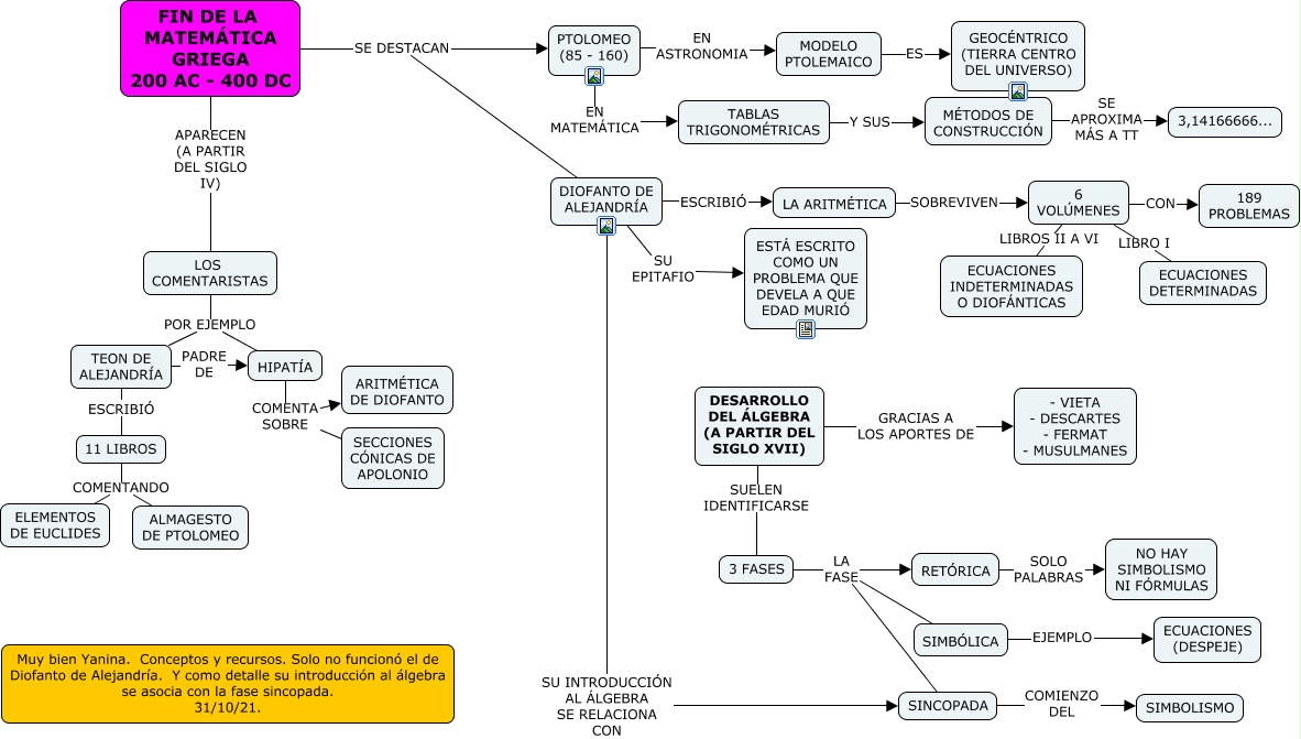 Este Cmap, tiene información relacionada con: 9. FIN DE LA MATEMÁTICA GRIEGA, DESARROLLO DEL ÁLGEBRA (A PARTIR DEL SIGLO XVII) SUELEN IDENTIFICARSE 3 FASES, HIPATÍA COMENTA SOBRE SECCIONES CÓNICAS DE APOLONIO, HIPATÍA COMENTA SOBRE ARITMÉTICA DE DIOFANTO, SIMBÓLICA EJEMPLO ECUACIONES (DESPEJE), PTOLOMEO (85 - 160) EN MATEMÁTICA TABLAS TRIGONOMÉTRICAS, PTOLOMEO (85 - 160) EN ASTRONOMIA MODELO PTOLEMAICO, TEON DE ALEJANDRÍA ESCRIBIÓ 11 LIBROS, TEON DE ALEJANDRÍA PADRE DE HIPATÍA, MÉTODOS DE CONSTRUCCIÓN SE APROXIMA MÁS A TT 3,14166666..., 3 FASES LA FASE SINCOPADA, 11 LIBROS COMENTANDO ELEMENTOS DE EUCLIDES, 11 LIBROS COMENTANDO ALMAGESTO DE PTOLOMEO, DIOFANTO DE ALEJANDRÍA SU INTRODUCCIÓN AL ÁLGEBRA SE RELACIONA CON SINCOPADA, TABLAS TRIGONOMÉTRICAS Y SUS MÉTODOS DE CONSTRUCCIÓN, RETÓRICA SOLO PALABRAS NO HAY SIMBOLISMO NI FÓRMULAS, MODELO PTOLEMAICO ES GEOCÉNTRICO (TIERRA CENTRO DEL UNIVERSO), 3 FASES LA FASE RETÓRICA, FIN DE LA MATEMÁTICA GRIEGA 200 AC - 400 DC SE DESTACAN DIOFANTO DE ALEJANDRÍA, LOS COMENTARISTAS POR EJEMPLO HIPATÍA, 6 VOLÚMENES LIBRO I ECUACIONES DETERMINADAS