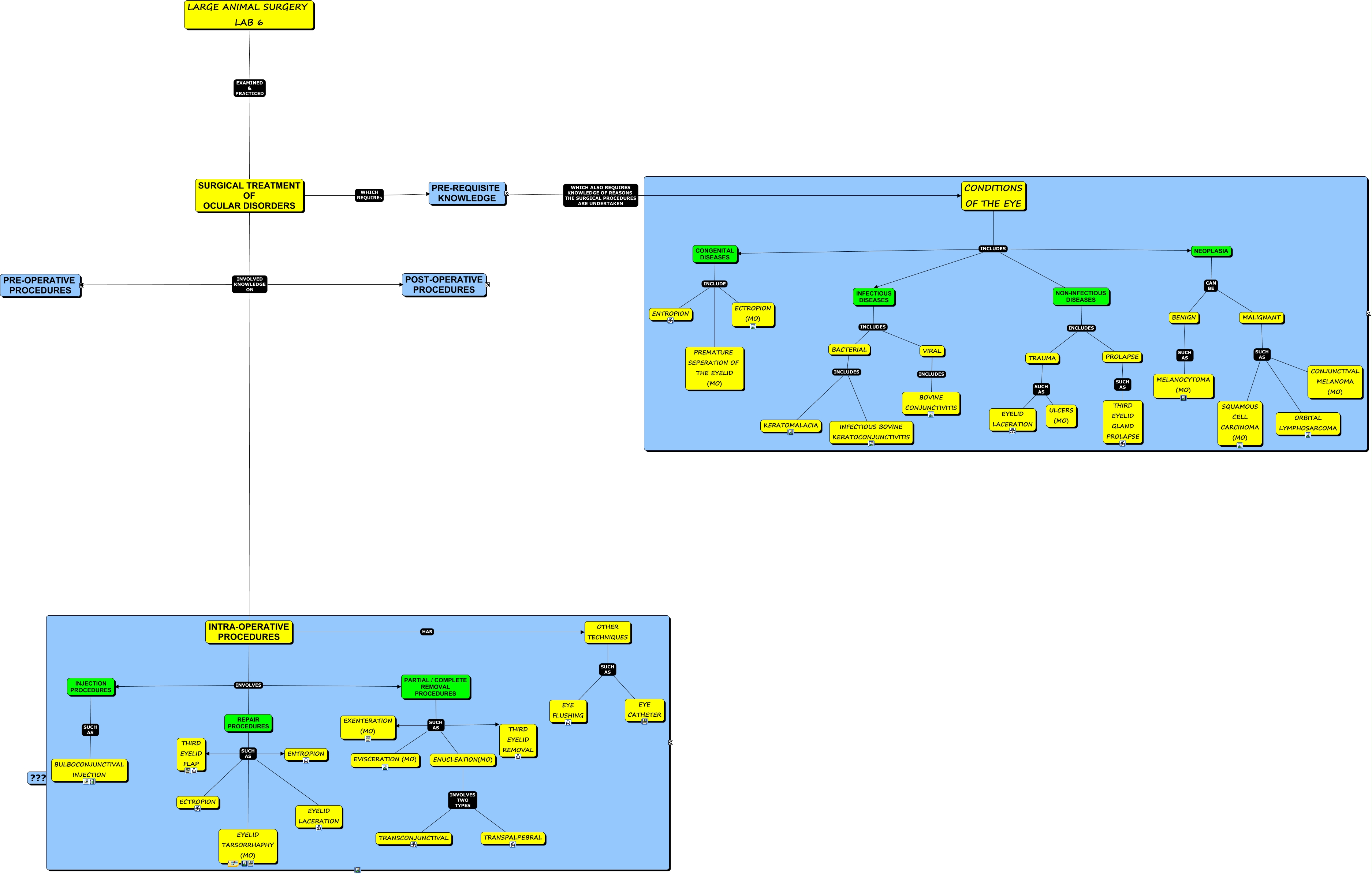 This Concept Map, created with IHMC CmapTools, has information related to: Lab 6 - Surgical Treatment of Occular Disorders 2, REPAIR PROCEDURES SUCH AS ENTROPION, PRE-REQUISITE KNOWLEDGE WHICH ALSO REQUIRES KNOWLEDGE OF REASONS THE SURGICAL PROCEDURES ARE UNDERTAKEN CONDITIONS OF THE EYE, Regional Nerve Blocks includes Petersons Retrobulbar Nerve Block, PRE-OPERATIVE PROCEDURES includes Signalment + History, Regional Nerve Blocks includes Supraorbital Retrobulbar Block, POST-OPERATIVE PROCEDURES INCLUDES COMPLICATIONS, PRE-OPERATIVE PROCEDURES includes Restraint, Regional Nerve Blocks includes 4 Point Retrobulbar Block, TRAUMA SUCH AS EYELID LACERATION, PRE-REQUISITE KNOWLEDGE INCLUDES Sutures (MO), CONDITIONS OF THE EYE INCLUDES INFECTIOUS DISEASES, CONGENITAL DISEASES INCLUDE ENTROPION, CONDITIONS OF THE EYE INCLUDES NON-INFECTIOUS DISEASES, OTHER TECHNIQUES SUCH AS EYE CATHETER, PARTIAL / COMPLETE REMOVAL PROCEDURES SUCH AS EXENTERATION (MO), REPAIR PROCEDURES SUCH AS THIRD EYELID FLAP, LARGE ANIMAL SURGERY LAB 6 EXAMINED & PRACTICED SURGICAL TREATMENT OF OCULAR DISORDERS, INTRA-OPERATIVE PROCEDURES HAS OTHER TECHNIQUES, CONDITIONS OF THE EYE INCLUDES NEOPLASIA, BACTERIAL INCLUDES INFECTIOUS BOVINE KERATOCONJUNCTIVITIS