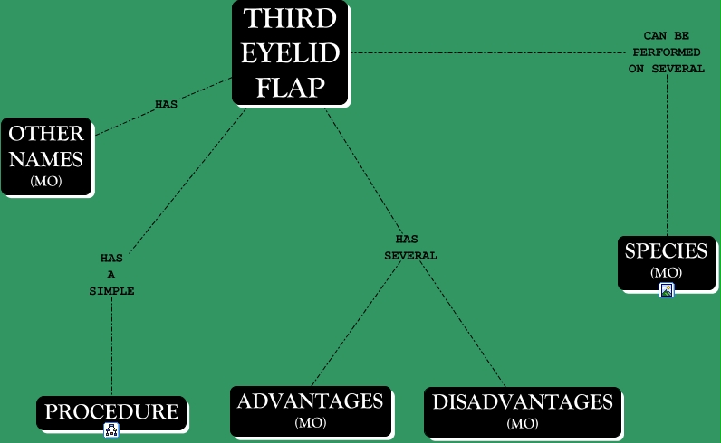 This Concept Map, created with IHMC CmapTools, has information related to: THIRD EYELID FLAP, THIRD EYELID FLAP HAS SEVERAL ADVANTAGES (MO), THIRD EYELID FLAP HAS SEVERAL DISADVANTAGES (MO), THIRD EYELID FLAP CAN BE PERFORMED ON SEVERAL SPECIES (MO), THIRD EYELID FLAP HAS OTHER NAMES (MO), THIRD EYELID FLAP HAS A SIMPLE PROCEDURE