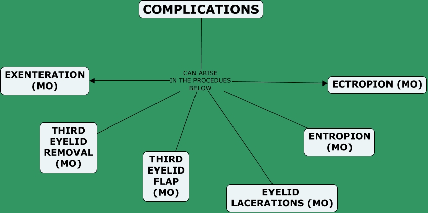 This Concept Map, created with IHMC CmapTools, has information related to: COMPLICATIONS, COMPLICATIONS CAN ARISE IN THE PROCEDUES BELOW EYELID LACERATIONS (MO), COMPLICATIONS CAN ARISE IN THE PROCEDUES BELOW THIRD EYELID FLAP (MO), COMPLICATIONS CAN ARISE IN THE PROCEDUES BELOW THIRD EYELID REMOVAL (MO), COMPLICATIONS CAN ARISE IN THE PROCEDUES BELOW ENTROPION (MO), COMPLICATIONS CAN ARISE IN THE PROCEDUES BELOW EXENTERATION (MO), COMPLICATIONS CAN ARISE IN THE PROCEDUES BELOW ECTROPION (MO)