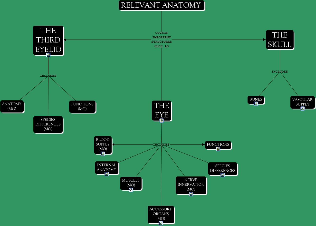 This Concept Map, created with IHMC CmapTools, has information related to: RELEVANT ANATOMY, THE EYE INCLUDES FUNCTIONS, THE SKULL INCLUDES VASCULAR SUPPLY, RELEVANT ANATOMY COVERS IMPORTANT STRUCTURES SUCH AS THE THIRD EYELID, THE EYE INCLUDES BLOOD SUPPLY (MO), THE THIRD EYELID INCLUDES ANATOMY (MO), THE EYE INCLUDES SPECIES DIFFERENCES, THE EYE INCLUDES NERVE INNERVATION (MO), RELEVANT ANATOMY COVERS IMPORTANT STRUCTURES SUCH AS THE EYE, THE EYE INCLUDES MUSCLES (MO), THE EYE INCLUDES INTERNAL ANATOMY, THE THIRD EYELID INCLUDES FUNCTIONS (MO), RELEVANT ANATOMY COVERS IMPORTANT STRUCTURES SUCH AS THE SKULL, THE THIRD EYELID INCLUDES SPECIES DIFFERENCES (MO), THE SKULL INCLUDES BONES, THE EYE INCLUDES ACCESSORY ORGANS (MO)