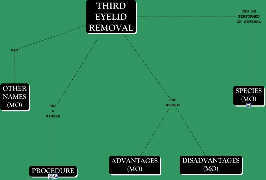This Concept Map, created with IHMC CmapTools, has information related to: THIRD EYELID REMOVAL, THIRD EYELID REMOVAL HAS SEVERAL DISADVANTAGES (MO), THIRD EYELID REMOVAL CAN BE PERFORMED ON SEVERAL SPECIES (MO), THIRD EYELID REMOVAL HAS SEVERAL ADVANTAGES (MO), THIRD EYELID REMOVAL HAS OTHER NAMES (MO), THIRD EYELID REMOVAL HAS A SIMPLE PROCEDURE