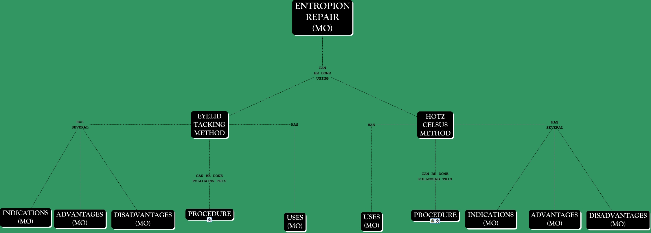 This Concept Map, created with IHMC CmapTools, has information related to: ENTROPION REPAIR, EYELID TACKING METHOD HAS SEVERAL DISADVANTAGES (MO), HOTZ CELSUS METHOD CAN BE DONE FOLLOWING THIS PROCEDURE, EYELID TACKING METHOD HAS USES (MO), ENTROPION REPAIR (MO) CAN BE DONE USING HOTZ CELSUS METHOD, EYELID TACKING METHOD HAS SEVERAL ADVANTAGES (MO), HOTZ CELSUS METHOD HAS SEVERAL DISADVANTAGES (MO), HOTZ CELSUS METHOD HAS SEVERAL ADVANTAGES (MO), EYELID TACKING METHOD CAN BE DONE FOLLOWING THIS PROCEDURE, EYELID TACKING METHOD HAS SEVERAL INDICATIONS (MO), HOTZ CELSUS METHOD HAS USES (MO), HOTZ CELSUS METHOD HAS SEVERAL INDICATIONS (MO), ENTROPION REPAIR (MO) CAN BE DONE USING EYELID TACKING METHOD