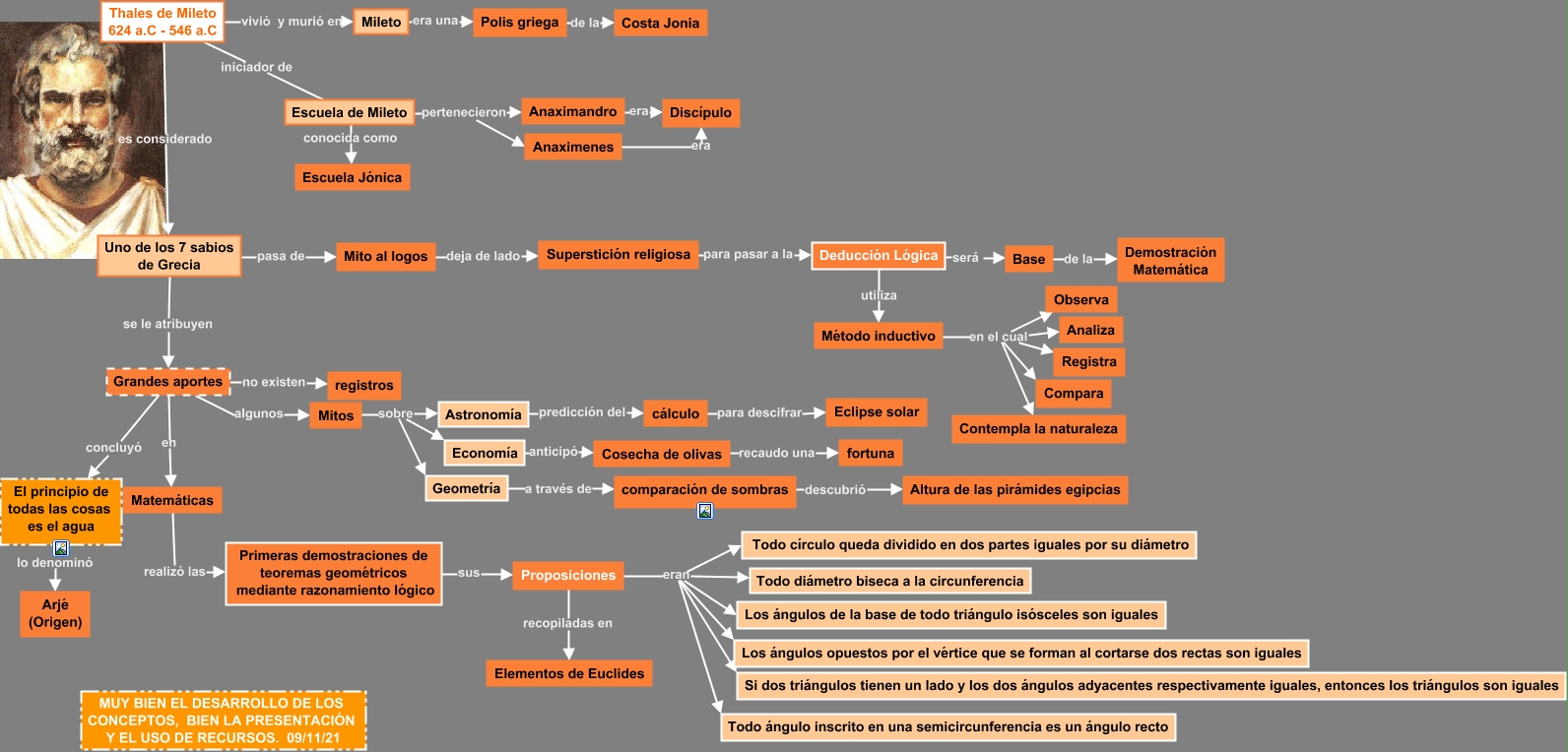 This Concept Map, created with IHMC CmapTools, has information related to: Thales de Mileto - Robledo, Grandes aportes algunos Mitos, Proposiciones eran Los ángulos de la base de todo triángulo isósceles son iguales, Anaximandro era Discípulo, Thales de Mileto 624 a.C - 546 a.C es considerado Uno de los 7 sabios de Grecia, Economía anticipó Cosecha de olivas, Método inductivo en el cual Analiza, Proposiciones eran Todo ángulo inscrito en una semicircunferencia es un ángulo recto, Thales de Mileto 624 a.C - 546 a.C vivió y murió en Mileto, Grandes aportes no existen registros, Mito al logos deja de lado Superstición religiosa, Uno de los 7 sabios de Grecia se le atribuyen Grandes aportes, Proposiciones eran Los ángulos opuestos por el vértice que se forman al cortarse dos rectas son iguales, Deducción Lógica será Base, Base de la Demostración Matemática, Superstición religiosa para pasar a la Deducción Lógica, Método inductivo en el cual Registra, Thales de Mileto 624 a.C - 546 a.C iniciador de Escuela de Mileto, Astronomía predicción del cálculo, Mitos sobre Astronomía, Escuela de Mileto pertenecieron Anaximenes
