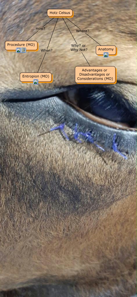 This Concept Map, created with IHMC CmapTools, has information related to: Hotz Celsus in cattle, Hotz Celsus Why? or Why Not? Advantages or Disadvantages or Considerations (MO), Hotz Celsus When? Entropion (MO), Hotz Celsus Where? Anatomy, Hotz Celsus How? Procedure (MO)