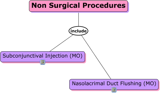 This Concept Map, created with IHMC CmapTools, has information related to: Non Surgical Procedures, Non Surgical Procedures include Subconjunctival Injection (MO), Non Surgical Procedures include Nasolacrimal Duct Flushing (MO)