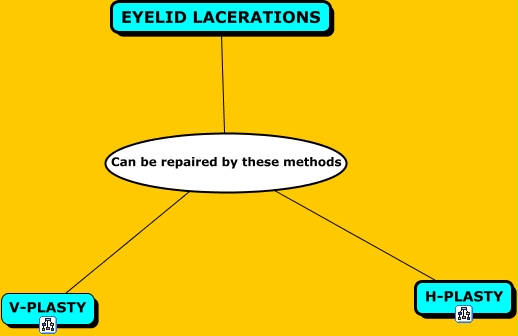 This Concept Map, created with IHMC CmapTools, has information related to: Eyelid Lacerations- Repair, EYELID LACERATIONS Can be repaired by these methods H-PLASTY, EYELID LACERATIONS Can be repaired by these methods V-PLASTY