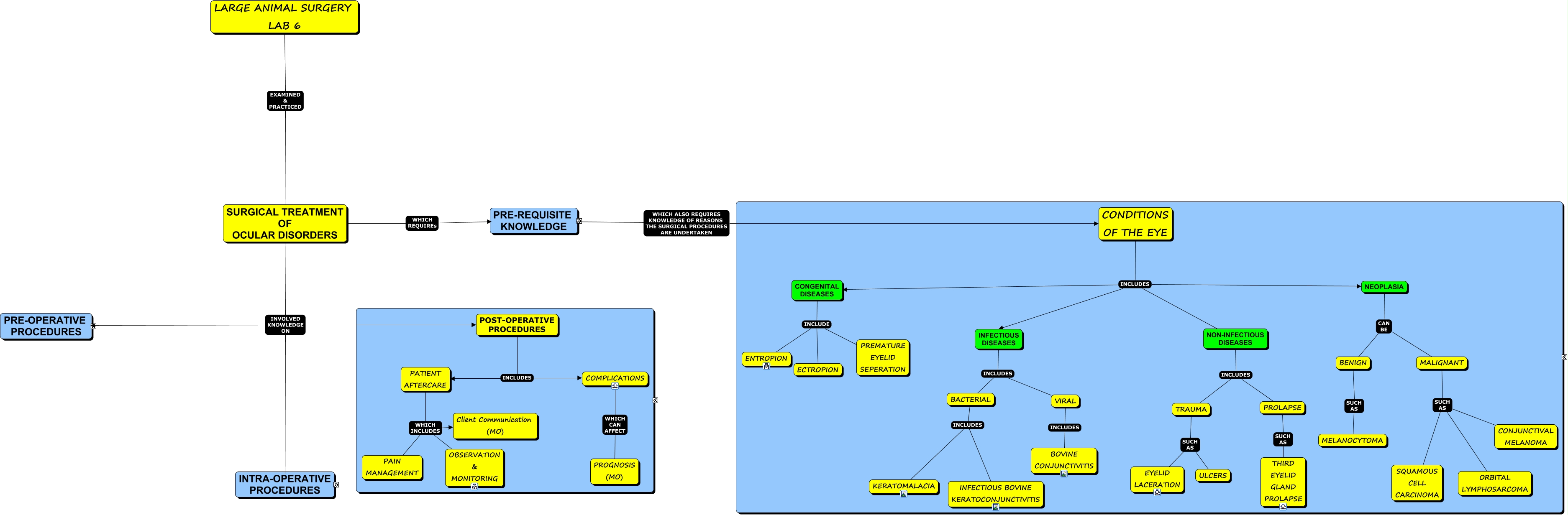This Concept Map, created with IHMC CmapTools, has information related to: Untitled, PRE-REQUISITE KNOWLEDGE INCLUDES Reasons (MO), 5 Station Exam to determine Blood Tests + Analysis, PRE-REQUISITE KNOWLEDGE INCLUDES Risks (MO), POST-OPERATIVE PROCEDURES INCLUDES PATIENT AFTERCARE, Drugs for Anesthesia, PARTIAL / COMPLETE REMOVAL PROCEDURES SUCH AS ENUCLEATION, PRE-REQUISITE KNOWLEDGE INCLUDES Client Communication + Education, PRE-REQUISITE KNOWLEDGE WHICH ALSO REQUIRES KNOWLEDGE OF REASONS THE SURGICAL PROCEDURES ARE UNDERTAKEN CONDITIONS OF THE EYE, INTRA-OPERATIVE PROCEDURES INVOLVES INJECTION PROCEDURES, CONGENITAL DISEASES INCLUDE ECTROPION, REPAIR PROCEDURES SUCH AS EYELID LACERATION, PRE-OPERATIVE PROCEDURES includes Signalment + History, PRE-REQUISITE KNOWLEDGE INCLUDES Relevant Anatomy, MALIGNANT SUCH AS SQUAMOUS CELL CARCINOMA, PARTIAL / COMPLETE REMOVAL PROCEDURES SUCH AS THIRD EYELID REMOVAL, INTRA-OPERATIVE PROCEDURES INVOLVES PARTIAL / COMPLETE REMOVAL PROCEDURES, INJECTION PROCEDURES SUCH AS BULBOCONJUNCTIVAL INJECTION, INTRA-OPERATIVE PROCEDURES INVOLVES REPAIR PROCEDURES, Regional Nerve Blocks includes 1 Point Retrobulbar Blocks, INTRA-OPERATIVE PROCEDURES HAS OTHER TECHNIQUES