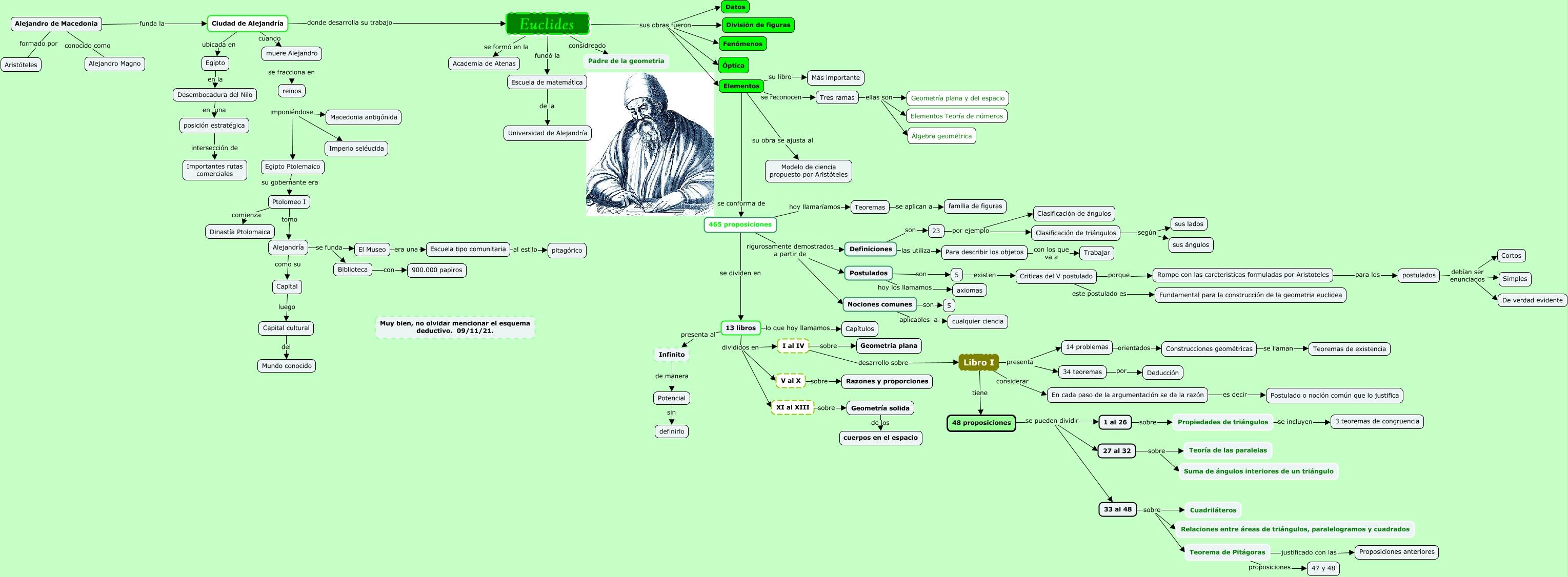 This Concept Map, created with IHMC CmapTools, has information related to: Euclides - Robledo, Ptolomeo I tomo Alejandría, Rompe con las carcteristicas formuladas por Aristoteles para los postulados, Egipto Ptolemaico su gobernante era Ptolomeo I, Elementos se conforma de 465 proposiciones, Libro I tiene 48 proposiciones, En cada paso de la argumentación se da la razón es decir Postulado o noción común que lo justifica, muere Alejandro se fracciona en reinos, Tres ramas ellas son Elementos Teoría de números, 48 proposiciones se pueden dividir 27 al 32, Elementos su libro Más importante, Capital luego Capital cultural, 465 proposiciones se dividen en 13 libros, Definiciones son 23, Euclides fundó la Escuela de matemática, Propiedades de triángulos se incluyen 3 teoremas de congruencia, 14 problemas orientados Construcciones geométricas, Egipto en la Desembocadura del Nilo, Euclides sus obras fueron Datos, Desembocadura del Nilo en una posición estratégica, 1 al 26 sobre Propiedades de triángulos