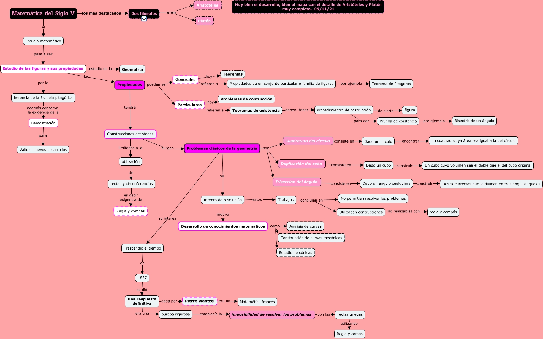 Este Cmap, tiene información relacionada con: Matemática del siglo V - Robledo, Dado un círculo encontrar un cuadradocuya área sea igual a la del círculo, Construcciones aceptadas limitadas a la utilización, Procedimientro de costrucción de cierta figura, Dado un ángulo cualquiera construir Dos semirrectas que lo dividan en tres ángulos iguales, Estudio de las figuras y sus propiedades estudio de la Geometría, Estudio de las figuras y sus propiedades las Propiedades, Estudio matemático pasa a ser Estudio de las figuras y sus propiedades, herencia de la Escuela pitagórica además conserva la exigencia de la Demostración, Dos filósofos eran Platón, Trascendió el tiempo en 1837, Dado un cubo construir Un cubo cuyo volumen sea el doble que el del cubo original, Desarrollo de conocimientos matemáticos como Análisis de curvas, Estudio de las figuras y sus propiedades por la herencia de la Escuela pitagórica, Duplicación del cubo consiste en Dado un cubo, Problemas clásicos de la geometría su Intento de resolución, Generales hoy Teoremas, Generales refieren a Propiedades de un conjunto particular o familia de figuras, Intento de resolución estos Trabajos, Dos filósofos eran Aristóteles, Prueba de existencia por ejemplo Bisectriz de un ángulo