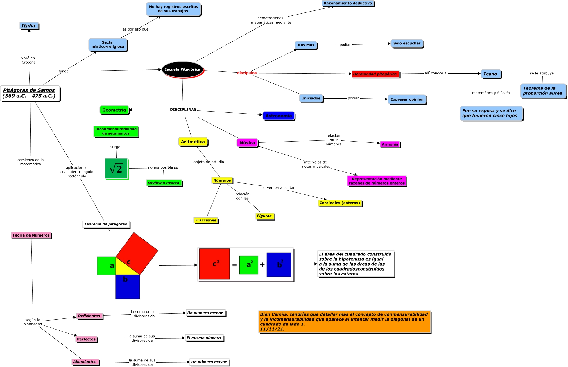 Este Cmap, tiene información relacionada con: Pitágoras, Inconmensurabilidad de segmentos surge, Pitágoras de Samos (569 a.C. - 475 a.C.) funda Escuela Pitagórica, Geometría ???? Inconmensurabilidad de segmentos, Escuela Pitagórica DISCIPLINAS Astronomía, Escuela Pitagórica demotraciones matemáticas mediante Razonamiento deductivo, Números ???? Fracciones, ???? El área del cuadrado construido sobre la hipotenusa es igual a la suma de las áreas de las de los cuadradosconstruidos sobre los catetos, Pitágoras de Samos (569 a.C. - 475 a.C.) vivió en Crotona Italia, Abundantes la suma de sus divisores da Un número mayor, Teorema de pitágoras, Escuela Pitagórica DISCIPLINAS Música, Música relación entre números Armonía, Escuela Pitagórica discípulos Novicios, Teoría de Números según la binariedad Abundantes, Pitágoras de Samos (569 a.C. - 475 a.C.) aplicación a cualquier triángulo rectángulo Teorema de pitágoras, no era posible su Medición exacta, Novicios podían Solo escuchar, Pitágoras de Samos (569 a.C. - 475 a.C.) comienzo de la matemática Teoría de Números, Hermandad pitagórica allí conoce a Teano, Música intervalos de notas musicales Representación mediante razones de números enteros