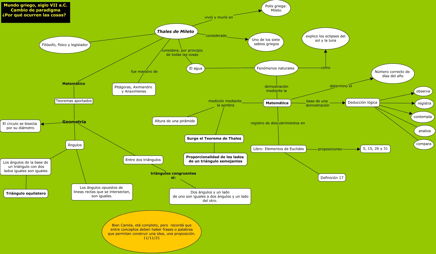 This Concept Map, created with IHMC CmapTools, has information related to: Thales de Mileto, Deducción lógica ???? observa, Teoremas aportados Geometría Entre dos triángulos, Libro: Elementos de Euclides proposiciones 5, 15, 26 y 31, Matemática medición mediante la sombra Altura de una pirámide, Surge el Teorema de Thales ???? Proporcionalidad de los lados de un triángulo semejantes, Teoremas aportados Geometría Ángulos, Los ángulos de la base de un triángulo con dos lados iguales son iguales. ???? Triángulo equilatero, Teoremas aportados Geometría El circulo se bisecta por su diámetro, Fenómenos naturales demostración mediante la Matemática, Matemática registro de descubrimientos en Libro: Elementos de Euclides, Ángulos ???? Los ángulos de la base de un triángulo con dos lados iguales son iguales., Thales de Mileto vivió y murió en Polis griega: Mileto, Matemática medición mediante la sombra Surge el Teorema de Thales, Fenómenos naturales como explico los eclipses del sol y la luna, Thales de Mileto ???? Filósofo, físico y legislador, Thales de Mileto considerado Uno de los siete sabios griegos, El agua ???? Fenómenos naturales, Entre dos triángulos triángulos congruentes si: Dos ángulos y un lado de uno son iguales a dos ángulos y un lado del otro., Deducción lógica ???? contempla, Thales de Mileto fue maestro de Pitágoras, Aximandro y Anaximenes
