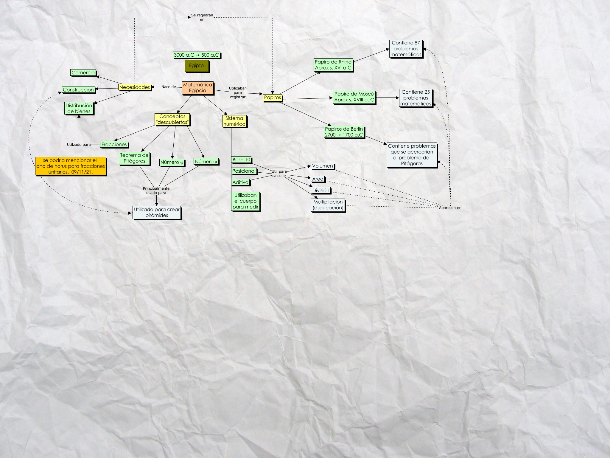 This Concept Map, created with IHMC CmapTools, has information related to: Egipto, Aditivo Util para calcular División, Area Aparecen en Contiene problemas que se acercarian al problema de Pitágoras, Volumen Aparecen en Contiene 25 problemas matemáticos, Matemática Egipcia Nace de Necesidades, Papiros de Berlin 2700 → 1700 a.C ???? Contiene problemas que se acercarian al problema de Pitágoras, Teorema de Pitágoras Principalmente usado para Utilizado para crear pirámides, Multipliación (duplicación) Aparecen en Contiene 87 problemas matemáticos, Papiros ???? Papiros de Berlin 2700 → 1700 a.C, Sistema numérico ???? Utilizaban el cuerpo para medir, Aditivo Util para calcular Multipliación (duplicación), Base 10 Util para calcular Area, Volumen Aparecen en Contiene 87 problemas matemáticos, Papiro de Moscú Aprox s. XVIII a. C ???? Contiene 25 problemas matemáticos, Matemática Egipcia ???? Sistema numérico, Base 10 Util para calcular Volumen, Utilizado para crear pirámides ???? Construcción, Número φ Principalmente usado para Utilizado para crear pirámides, Area Aparecen en Contiene 87 problemas matemáticos, Papiro de Rhind Aprox s. XVI a.C ???? Contiene 87 problemas matemáticos, Conceptos "descubiertos" ???? Número π