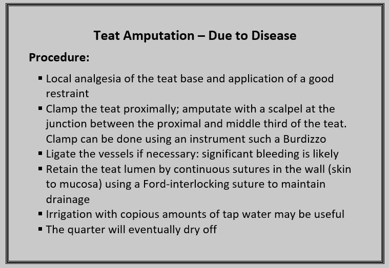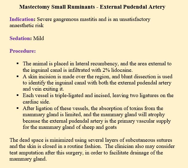 Article - Surgical Management of Lactolith Cow.pdf Article - Total Mastectomy in a Cow with Gangrenous Mastitis.pdf Article - Unilateral Gangrenous Mastitis Surgical Management.pdf Freely Moveable Obstructions.JPG Goat Mastectomy - Video.url Hard Milkers.JPG Ligation follwed by Sclerotherapy.JPG Obstruction Pathologies - Backup.cmap Pathologies Affecting Milk Flow.cmap Phlebectomy.JPG Radical Mastectomy - Small Ruminants.pdf Rosette of Furstenberg Obstruction.pdf Sclerotherapy.JPG Silastic Implant.JPG Silastic Implant 2.JPG Small Ruminants - External Pudendal Vessels Ligation.JPG Teat Amputation (Disease) - Procedure.JPG Teat Amputation (Injury) - Procedure.JPG Udder Amputation - Physiologic Mastectomy via Flank Laparotomy.pdf Udder Amputation - Traditional Technique.pdf