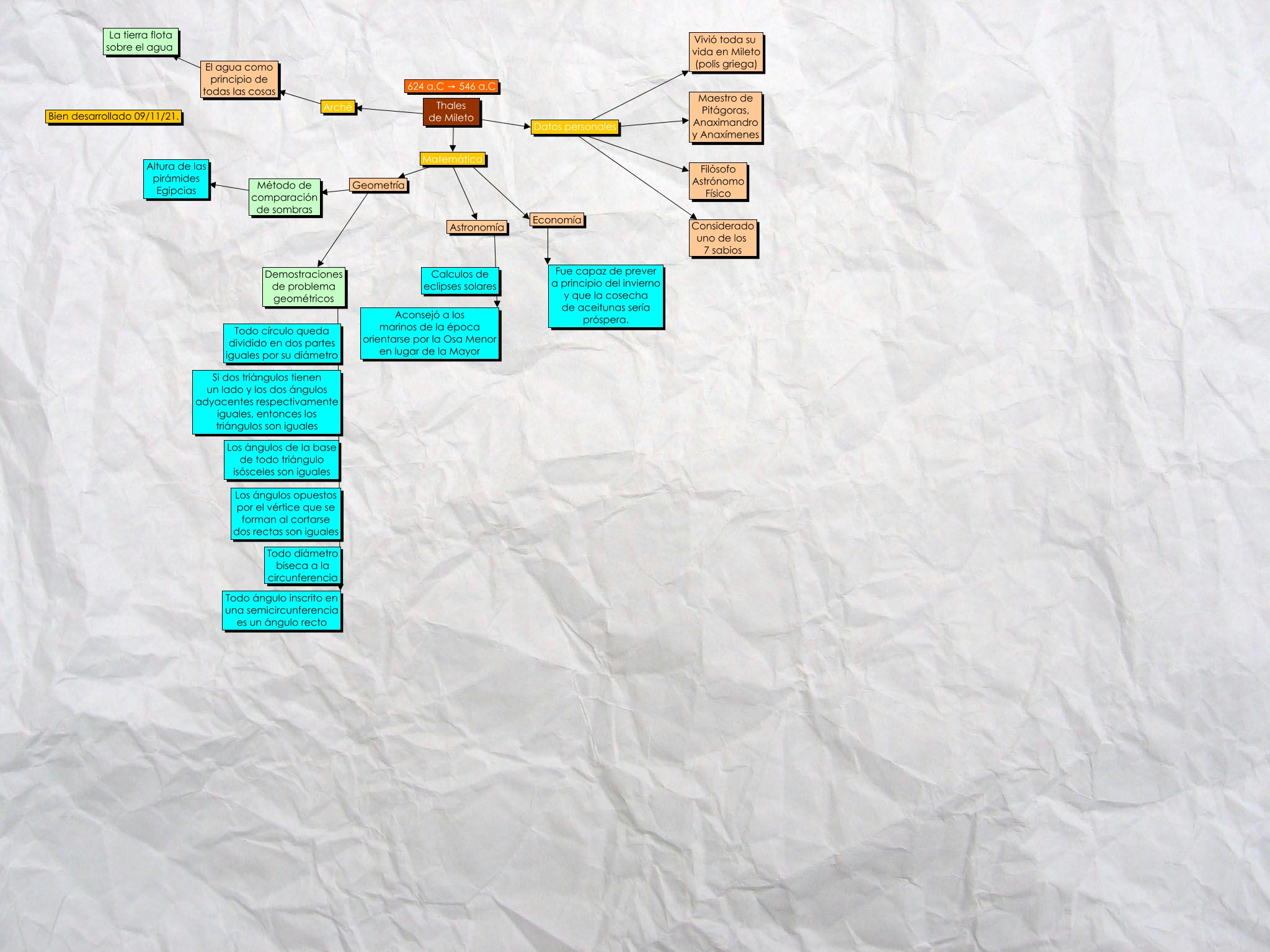 This Concept Map, created with IHMC CmapTools, has information related to: Tales de Mileto, Geometría ???? Demostraciones de problema geométricos, Método de comparación de sombras ???? Altura de las pirámides Egipcias, Datos personales ???? Vivió toda su vida en Mileto (polis griega), Astronomía ???? Aconsejó a los marinos de la época orientarse por la Osa Menor en lugar de la Mayor, Matemática ???? Astronomía, Demostraciones de problema geométricos ???? Todo ángulo inscrito en una semicircunferencia es un ángulo recto, El agua como principio de todas las cosas ???? La tierra flota sobre el agua, Datos personales ???? Considerado uno de los 7 sabios, Thales de Mileto ???? Datos personales, Geometría ???? Método de comparación de sombras, Thales de Mileto ???? Arché, Thales de Mileto ???? Matemática, Economía ???? Fue capaz de prever a principio del invierno y que la cosecha de aceitunas sería próspera., Matemática ???? Geometría, Datos personales ???? Filósofo Astrónomo Físico, Datos personales ???? Maestro de Pitágoras, Anaximandro y Anaxímenes, Matemática ???? Economía, Arché ???? El agua como principio de todas las cosas