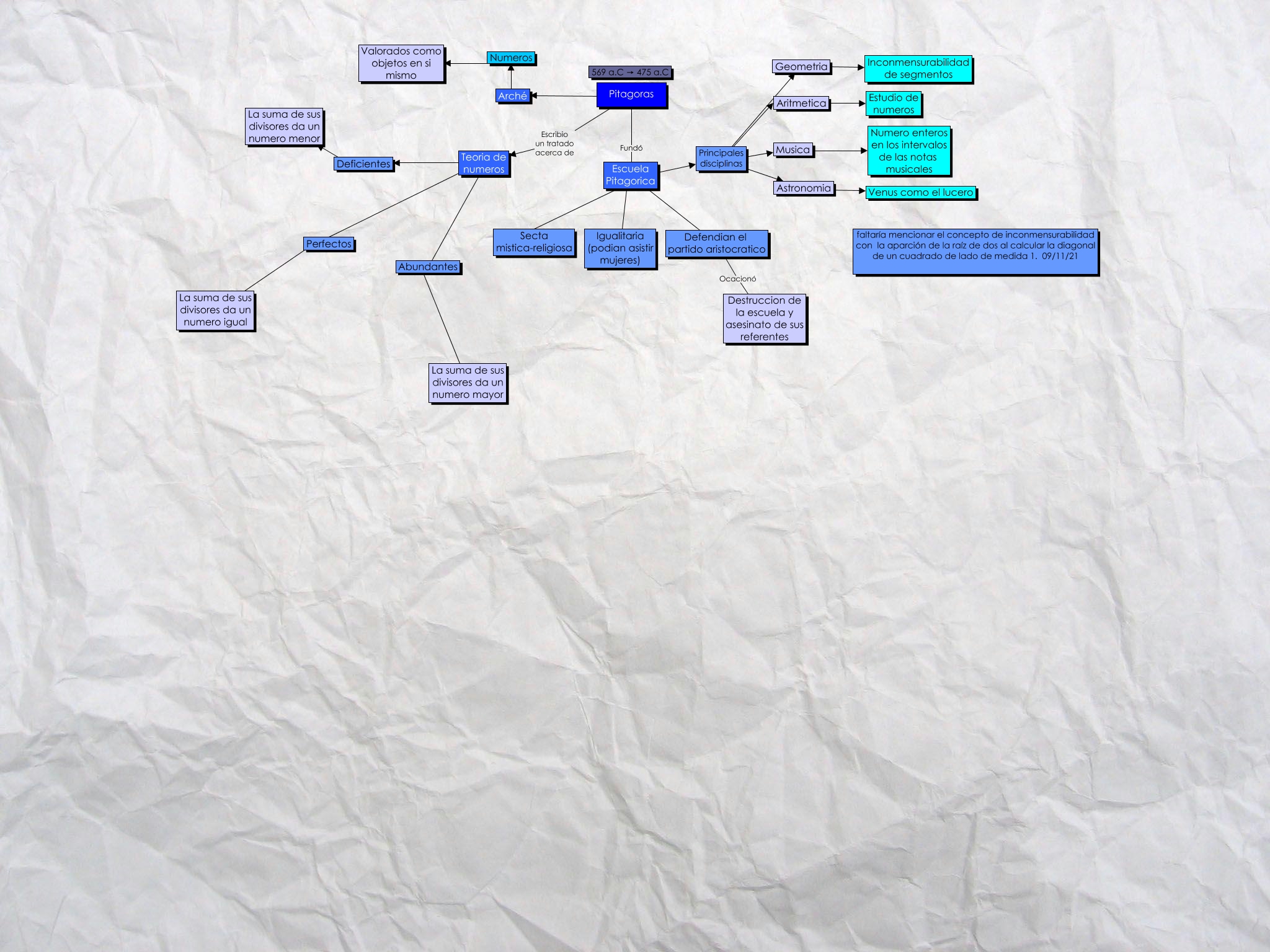Este Cmap, tiene información relacionada con: Pitagoras, Teoria de numeros ???? Abundantes, Perfectos ???? La suma de sus divisores da un numero igual, Escuela Pitagorica ???? Principales disciplinas, Escuela Pitagorica ???? Igualitaria (podian asistir mujeres), Pitagoras ???? Arché, Defendian el partido aristocratico Ocacionó Destruccion de la escuela y asesinato de sus referentes, Deficientes ???? La suma de sus divisores da un numero menor, Astronomia ???? Venus como el lucero, Arché ???? Numeros, Teoria de numeros ???? Deficientes, Principales disciplinas ???? Aritmetica, Principales disciplinas ???? Musica, Escuela Pitagorica ???? Secta mistica-religiosa, Teoria de numeros ???? Perfectos, Geometria ???? Inconmensurabilidad de segmentos, Pitagoras Escribio un tratado acerca de Teoria de numeros, Escuela Pitagorica ???? Defendian el partido aristocratico, Pitagoras Fundó Escuela Pitagorica, Abundantes ???? La suma de sus divisores da un numero mayor, Principales disciplinas ???? Geometria