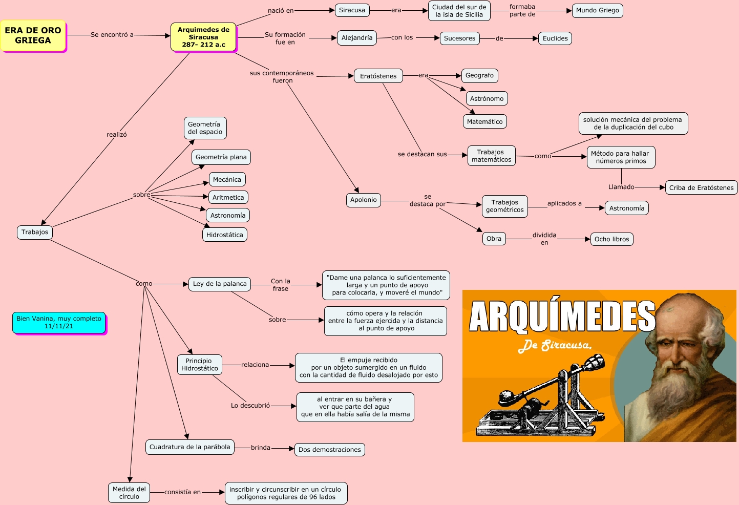 This Concept Map, created with IHMC CmapTools, has information related to: 7-ERA DE ORO GRIEGA, Eratóstenes era Matemático, Arquimedes de Siracusa 287- 212 a.c sus contemporáneos fueron Eratóstenes, Trabajos como Ley de la palanca, Sucesores de Euclides, Trabajos sobre Geometría plana, Trabajos matemáticos como solución mecánica del problema de la duplicación del cubo, Trabajos como Cuadratura de la parábola, Ley de la palanca sobre cómo opera y la relación entre la fuerza ejercida y la distancia al punto de apoyo, Alejandría con los Sucesores, Trabajos sobre Aritmetica, Trabajos sobre Mecánica, Eratóstenes se destacan sus Trabajos matemáticos, Trabajos matemáticos como Método para hallar números primos, Trabajos sobre Astronomía, Trabajos sobre Geometría del espacio, ERA DE ORO GRIEGA Se encontró a Arquimedes de Siracusa 287- 212 a.c, Cuadratura de la parábola brinda Dos demostraciones, Trabajos como Principio Hidrostático, Principio Hidrostático relaciona El empuje recibido por un objeto sumergido en un fluido con la cantidad de fluido desalojado por esto, Medida del círculo consistía en inscribir y circunscribir en un círculo polígonos regulares de 96 lados