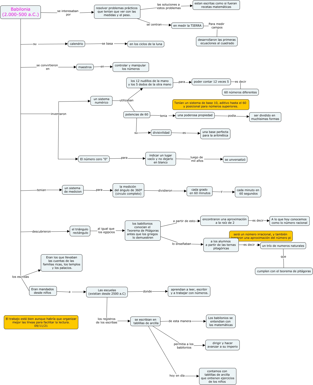 Este Cmap, tiene información relacionada con: Babilonia, El número cero "0" para indicar un lugar vacío y no dejarlo en blanco, a los alumnos a partir de las ternas pitagóricas es decir un trío de numeros naturales, Babilonia (2.000-500 a.C.) se convirtieron en maestros, los 12 nudillos de la mano y los 5 dedos de la otra mano para poder contar 12 veces 5, los babillonios conocian el Teorema de Pitágoras antes que los griegos lo demuestren lo enseñaban a los alumnos a partir de las ternas pitagóricas, poder contar 12 veces 5 es decir 60 números diferentes, Eran mandados desde niños a Las escuelas (existian desde 2500 a.C), Las escuelas (existian desde 2500 a.C) los registros de los escribas se escribian en tablillas de arcilla, en medir la TIERRA Para medir campos desarrollaron las primeras ecuacíones al cuadrado, resolver problemas prácticos que tenían que ver con las medidas y el peso. se centran en medir la TIERRA, los babillonios conocian el Teorema de Pitágoras antes que los griegos lo demuestren a partir de esto encontraron una aproximación a la raíz de 2, un sistema numérico utilizaban los 12 nudillos de la mano y los 5 dedos de la otra mano, un sistema de medicion para la medición del ángulo de 360º (circulo completo), se escribian en tablillas de arcilla hoy en día contamos con tablillas de arcilla que ontienen ejercicios de los niños, el triángulo rectángulo al igual que los egipcios los babillonios conocian el Teorema de Pitágoras antes que los griegos lo demuestren, un sistema numérico utilizaban potencias de 60, maestros en controlar y manipular los números, Babilonia (2.000-500 a.C.) inventaron El número cero "0", Las escuelas (existian desde 2500 a.C) donde aprendian a leer, escribir y a trabajar con números., Babilonia (2.000-500 a.C.) se interesaban por resolver problemas prácticos que tenían que ver con las medidas y el peso.