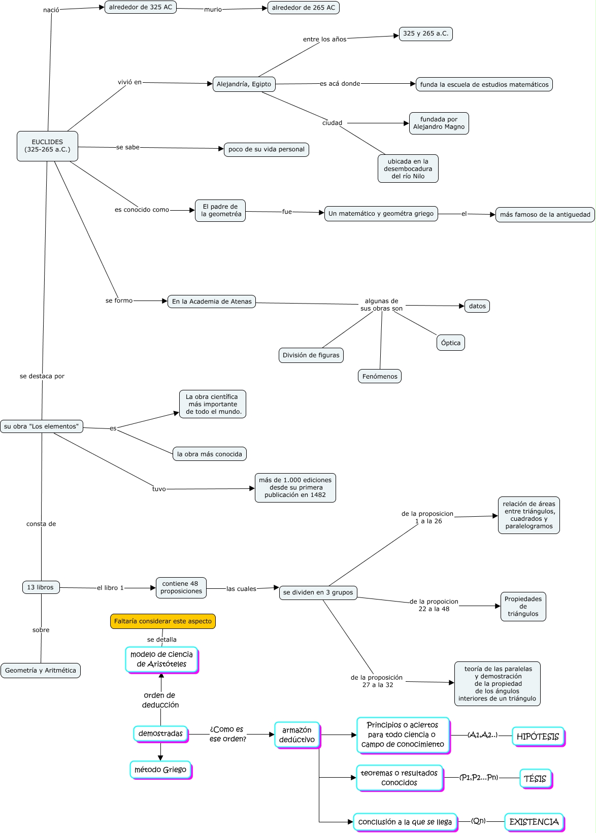 This Concept Map, created with IHMC CmapTools, has information related to: Euclides, Alejandría, Egipto es acá donde funda la escuela de estudios matemáticos, EUCLIDES (325-265 a.C.) se destaca por su obra "Los elementos", En la Academia de Atenas algunas de sus obras son Fenómenos, Alejandría, Egipto ciudad ubicada en la desembocadura del río Nilo, Alejandría, Egipto ciudad fundada por Alejandro Magno, su obra "Los elementos" es La obra científica más importante de todo el mundo., EUCLIDES (325-265 a.C.) vivió en Alejandría, Egipto, EUCLIDES (325-265 a.C.) es conocido como El padre de la geometréa, se dividen en 3 grupos de la proposición 27 a la 32 teoría de las paralelas y demostración de la propiedad de los ángulos interiores de un triángulo, EUCLIDES (325-265 a.C.) se formo En la Academia de Atenas, demostradas método Griego, su obra "Los elementos" tuvo más de 1.000 ediciones desde su primera publicación en 1482, El padre de la geometréa fue Un matemático y geométra griego, Principios o aciertos para todo ciencia o campo de conocimiento (A1,A2..) HIPÓTESIS, su obra "Los elementos" es la obra más conocida, conclusión a la que se llega (Qn) EXISTENCIA, 13 libros el libro 1 contiene 48 proposiciones, contiene 48 proposiciones las cuales se dividen en 3 grupos, su obra "Los elementos" consta de 13 libros, Faltaría considerar este aspecto se detalla modelo de ciencia de Aristóteles