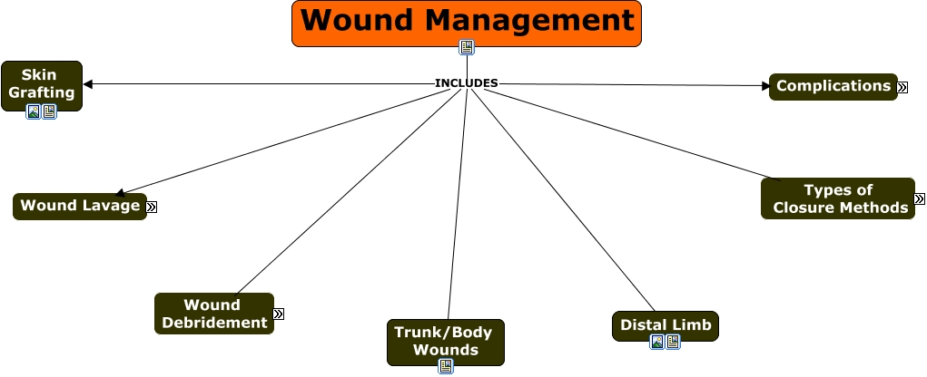 This Concept Map, created with IHMC CmapTools, has information related to: Wound Management, Wound Management INCLUDES Types of Closure Methods, Selective Debridement Includes Definition (MO), Fluids Types Saline (MO), Types of Closure Methods Comprises of Primary Closure, Wound Management INCLUDES Trunk/Body Wounds, Non-Selective Debridement Includes Methods, Fluids Types Povidone-Iodine (MO), Wound Lavage Includes Definition (MO), Wound Management INCLUDES Wound Lavage, Complications includes Exuberant Granulation Tissue (MO), Complications includes Sarcoids (MO), Wound Lavage Includes Fluids, Wound Management INCLUDES Wound Debridement, Types of Closure Methods Comprises of Second Intention Healing, Types of Closure Methods Comprises of Primary and Secondary Delayed Closure, Wound Management INCLUDES Skin Grafting, Wound Management INCLUDES Distal Limb, Complications includes Cellulitis (MO), Fluids Types Water (MO), Complications includes Wound Infection (MO)
