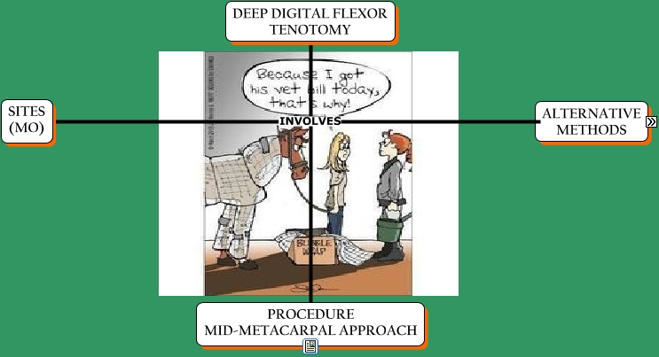 This Concept Map, created with IHMC CmapTools, has information related to: DEEP DIGITAL FLEXOR TENOTOMY, EXTERNAL FIXATION (MO) INCLUDES ALTERNATIVE METHODS, PROCEDURE MID-METACARPAL APPROACH INVOLVES DEEP DIGITAL FLEXOR TENOTOMY, MODIFIED MINIMALLY INVASIVE DISTAL APPROACH (MO) INCLUDES ALTERNATIVE METHODS, ALTERNATIVE METHODS INVOLVES DEEP DIGITAL FLEXOR TENOTOMY, PASTERN APPROACH (MO) INCLUDES ALTERNATIVE METHODS, SITES (MO) INVOLVES DEEP DIGITAL FLEXOR TENOTOMY, DISTAL CHECK DESMOTOMY INCLUDES ALTERNATIVE METHODS, PROXIMAL CHECK DESMOTOMY INCLUDES ALTERNATIVE METHODS