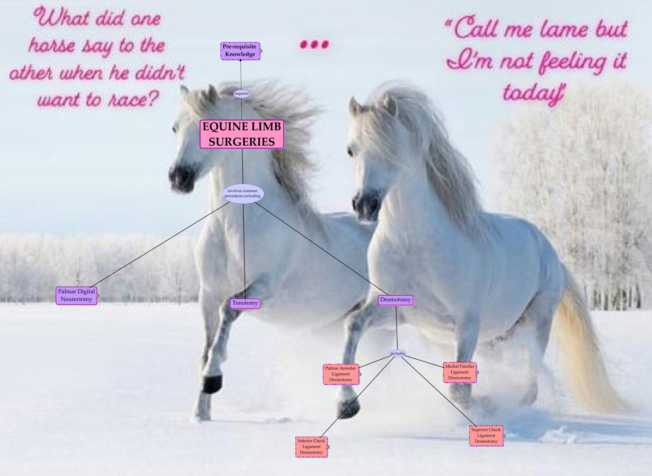 This Concept Map, created with IHMC CmapTools, has information related to: Group 2- Lab 10 - Equine Limb surgery, Pre-requisite Knowledge includes Equine Lameness, PALMAR DIGITAL NEURECTOMY further includes Complications, Inferior Check Ligament Desmotomy Involves Procedures, Palmar Annular Ligament Desmotomy(MO) consists of Indications, EQUINE LIMB SURGERIES involves common procedures including PALMAR DIGITAL NEURECTOMY, TENOTOMY such as Deep Digital Flexor Tenotomy, Superior Check Ligament Desmotomy Involves Prognosis (MO), PALMAR DIGITAL NEURECTOMY further includes Prognosis, Medial Patellar Ligament Desmotomy consists of Procedure, Deep Digital Flexor Tenotomy involves Complications & Prognosis, Desmotomy includes Palmar Annular Ligament Desmotomy(MO), Deep Digital Flexor Tenotomy involves Advantages Disadvantages, Inferior Check Ligament Desmotomy Involves Indications (MO), Deep Digital Flexor Tenotomy involves Indications, Deep Digital Flexor Tenotomy involves Procedure, Inferior Check Ligament Desmotomy Involves Prognosis (MO), EQUINE LIMB SURGERIES involves common procedures including Desmotomy, PALMAR DIGITAL NEURECTOMY includes Indications of Uses, PALMAR DIGITAL NEURECTOMY involves Procedure, Superior Check Ligament Desmotomy Involves Indications (MO)