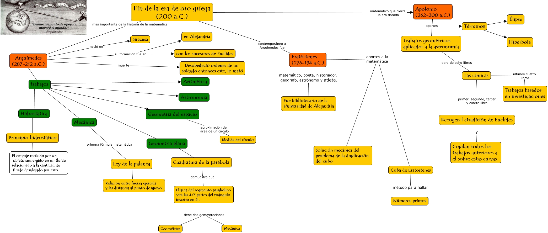 Este Cmap, tiene información relacionada con: Era de oro griega, Criba de Eratóstenes método para hallar Números primos, Las cónicas últimos cuatro libros Trabajos basados en investigaciones, trabajos ???? Geometría plana, Arquímedes (287-212 a.C.) nació en Siracusa, trabajos ???? Mecánica, Términos ???? Hiperbola, Términos ???? Élipse, trabajos ???? Aritmética, Las cónicas primer, segundo, tercer y cuarto libro Recogen l atradición de Euclides, Fin de la era de oro griega (200 a.C.) contemporáneo a Arquimedes fue Eratóstenes (276-194 a.C.), Eratóstenes (276-194 a.C.) matemático, poeta, historiador, geografo, astrónomo y atleta. Fue bibliotecario de la Universidad de Alejandría, Arquímedes (287-212 a.C.) su formación fue en en Alejandría, El área del segmento parabólico será las 4/3 partes del triángulo inscrito en él. tiene dos demostraciones Mecánica, Ley de la palanca ???? Relación entre fuerza ejercida y las distancia al punto de apoyo., Mecánica primera fórmula matemática Ley de la palanca, Eratóstenes (276-194 a.C.) aportes a la matemática Criba de Eratóstenes, El área del segmento parabólico será las 4/3 partes del triángulo inscrito en él. tiene dos demostraciones Mecánica, El área del segmento parabólico será las 4/3 partes del triángulo inscrito en él. tiene dos demostraciones Geométrica, Principio hidrostático ???? El empuje recibido por un objeto sumergido en un fluido relacionado a la cantidad de fluido desalojado por esto., Apolonio (262-200 a.C.) aportes Términos