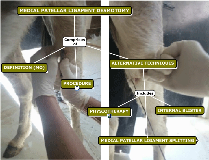 This Concept Map, created with IHMC CmapTools, has information related to: Medial Patellar Ligament Desmotomy, MEDIAL PATELLAR LIGAMENT SPLITTING Includes PROCEDURE, ALTERNATIVE TECHNIQUES Includes PHYSIOTHERAPY, MEDIAL PATELLAR LIGAMENT DESMOTOMY Comprises of PROCEDURE, MEDIAL PATELLAR LIGAMENT DESMOTOMY Comprises of DEFINITION (MO), ALTERNATIVE TECHNIQUES Includes INTERNAL BLISTER, ALTERNATIVE TECHNIQUES Includes MEDIAL PATELLAR LIGAMENT SPLITTING, MEDIAL PATELLAR LIGAMENT DESMOTOMY Comprises of ALTERNATIVE TECHNIQUES, MEDIAL PATELLAR LIGAMENT SPLITTING Includes CONSIDERATIONS (MO)