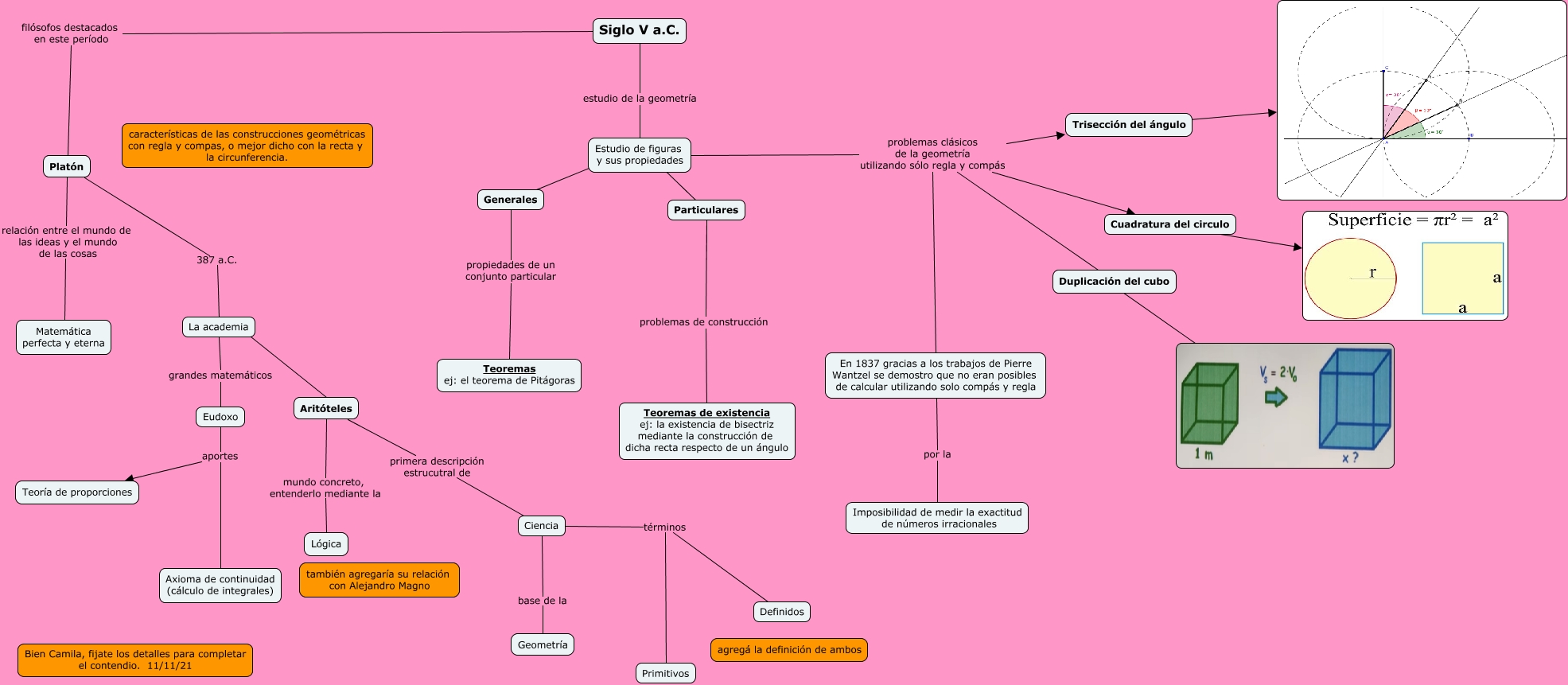 Este Cmap, tiene información relacionada con: Siglo V, Estudio de figuras y sus propiedades ???? Particulares, Aritóteles primera descripción estrucutral de Ciencia, La academia grandes matemáticos Eudoxo, Siglo V a.C. filósofos destacados en este período Platón, Cuadratura del circulo ????, Platón relación entre el mundo de las ideas y el mundo de las cosas Matemática perfecta y eterna, Eudoxo aportes Axioma de continuidad (cálculo de integrales), Eudoxo aportes Teoría de proporciones, Estudio de figuras y sus propiedades ???? Generales, Trisección del ángulo ????, En 1837 gracias a los trabajos de Pierre Wantzel se demostro que no eran posibles de calcular utilizando solo compás y regla por la Imposibilidad de medir la exactitud de números irracionales, Duplicación del cubo ????, Ciencia términos Definidos, Ciencia base de la Geometría, Estudio de figuras y sus propiedades problemas clásicos de la geometría utilizando sólo regla y compás Duplicación del cubo, Estudio de figuras y sus propiedades problemas clásicos de la geometría utilizando sólo regla y compás Cuadratura del circulo, Estudio de figuras y sus propiedades problemas clásicos de la geometría utilizando sólo regla y compás En 1837 gracias a los trabajos de Pierre Wantzel se demostro que no eran posibles de calcular utilizando solo compás y regla, Aritóteles mundo concreto, entenderlo mediante la Lógica, Ciencia términos Primitivos, Particulares problemas de construcción Teoremas de existencia ej: la existencia de bisectriz mediante la construcción de dicha recta respecto de un ángulo