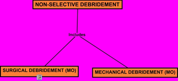 This Concept Map, created with IHMC CmapTools, has information related to: Non-Selective Debridement, NON-SELECTIVE DEBRIDEMENT Includes MECHANICAL DEBRIDEMENT (MO), NON-SELECTIVE DEBRIDEMENT Includes SURGICAL DEBRIDEMENT (MO)