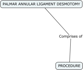 This Concept Map, created with IHMC CmapTools, has information related to: PALMAR ANNUAL LIGAMENT DESMOTOMY, PALMAR ANNULAR LIGAMENT DESMOTOMY Comprises of PROCEDURE