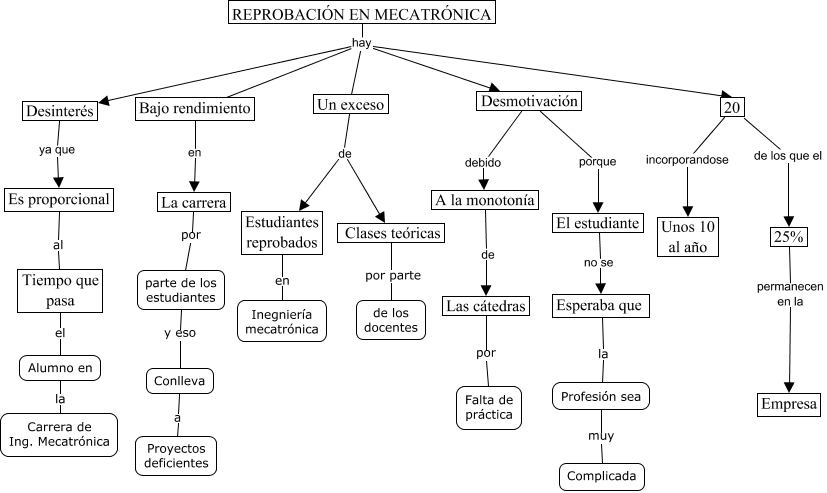 This Concept Map, created with IHMC CmapTools, has information related to: Reprobación en Mecatrónica, Desmotivación porque El estudiante, REPROBACIÓN EN MECATRÓNICA hay Bajo rendimiento, Tiempo que pasa el Alumno en, Un exceso de Estudiantes reprobados, Clases teóricas por parte de los docentes, 20 de los que el 25%, Desmotivación debido A la monotonía, Profesión sea muy Complicada, parte de los estudiantes y eso Conlleva, Conlleva a Proyectos deficientes, Bajo rendimiento en La carrera, Alumno en la Carrera de Ing. Mecatrónica, El estudiante no se Esperaba que, Estudiantes reprobados en Inegniería mecatrónica, La carrera por parte de los estudiantes, 20 incorporandose Unos 10 al año, Las cátedras por Falta de práctica, Es proporcional al Tiempo que pasa, REPROBACIÓN EN MECATRÓNICA hay Desmotivación, A la monotonía de Las cátedras