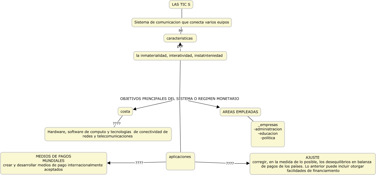 Este Cmap, tiene información relacionada con: mapa conceptual, AREAS EMPLEADAS ???? _empresas -administracion -educacion -politica, aplicaciones ???? MEDIOS DE PAGOS MUNDIALES crear y desarrollar medios de pago internacionalmente aceptados, la inmaterialidad, interatividad, instatnteniedad OBJETIVOS PRINCIPALES DEL SISTEMA O REGIMEN MONETARIO costa, la inmaterialidad, interatividad, instatnteniedad por caracteristicas, Sistema de comunicacion que conecta varios euipos se caracteristicas, aplicaciones ???? AJUSTE corregir, en la medida de lo posible, los desequilibrios en balanza de pagos de los países. Lo anterior puede incluir otorgar facilidades de financiamiento, costa ???? Hardware, software de computo y tecnologias de conectividad de redes y telecomunicaciones, LAS TIC S ???? Sistema de comunicacion que conecta varios euipos, la inmaterialidad, interatividad, instatnteniedad OBJETIVOS PRINCIPALES DEL SISTEMA O REGIMEN MONETARIO aplicaciones, la inmaterialidad, interatividad, instatnteniedad OBJETIVOS PRINCIPALES DEL SISTEMA O REGIMEN MONETARIO AREAS EMPLEADAS